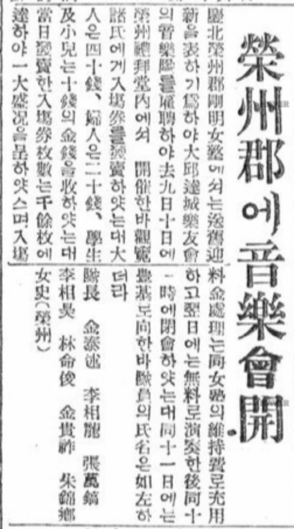 경북 영주군 강명여숙(剛明旅宿)에서는 송구영신을 표하기 위하여 대구 달성악우회(達城樂友會)의 음악대를 고빙하여 거 9일, 10일에 영주예배당 내에서 개최한 바 관람 제씨에게 입장권을 발매하였는데 대인은 40전, 부인은 20전, 학생 및 소아는 10전의 금전을 받았는는데 당일 발매한 입장권 매수는 천여 매에 달하여 일대 성황을 이루었으며, 입장 요금 처리는 동 여서숙의 유지비로 충용하고 익일에는 무료로 연주한 후 동 11시에 폐회하였는데 동 11일에는 풍기로 향한 바 대원의 씨명은 여좌하더라.
