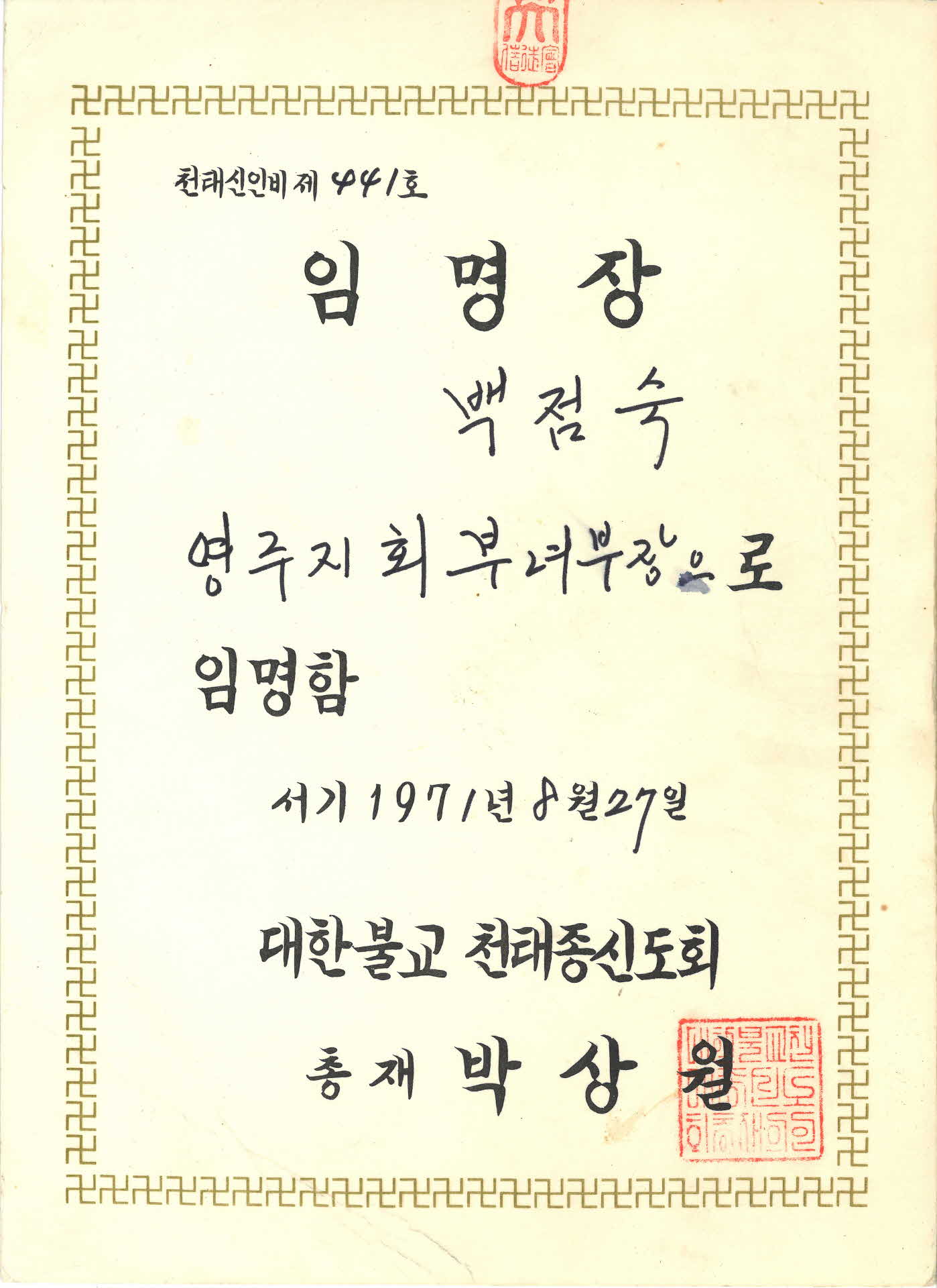 | 기록물명 | 대한불교 천태종 신도회 임명장 | ||