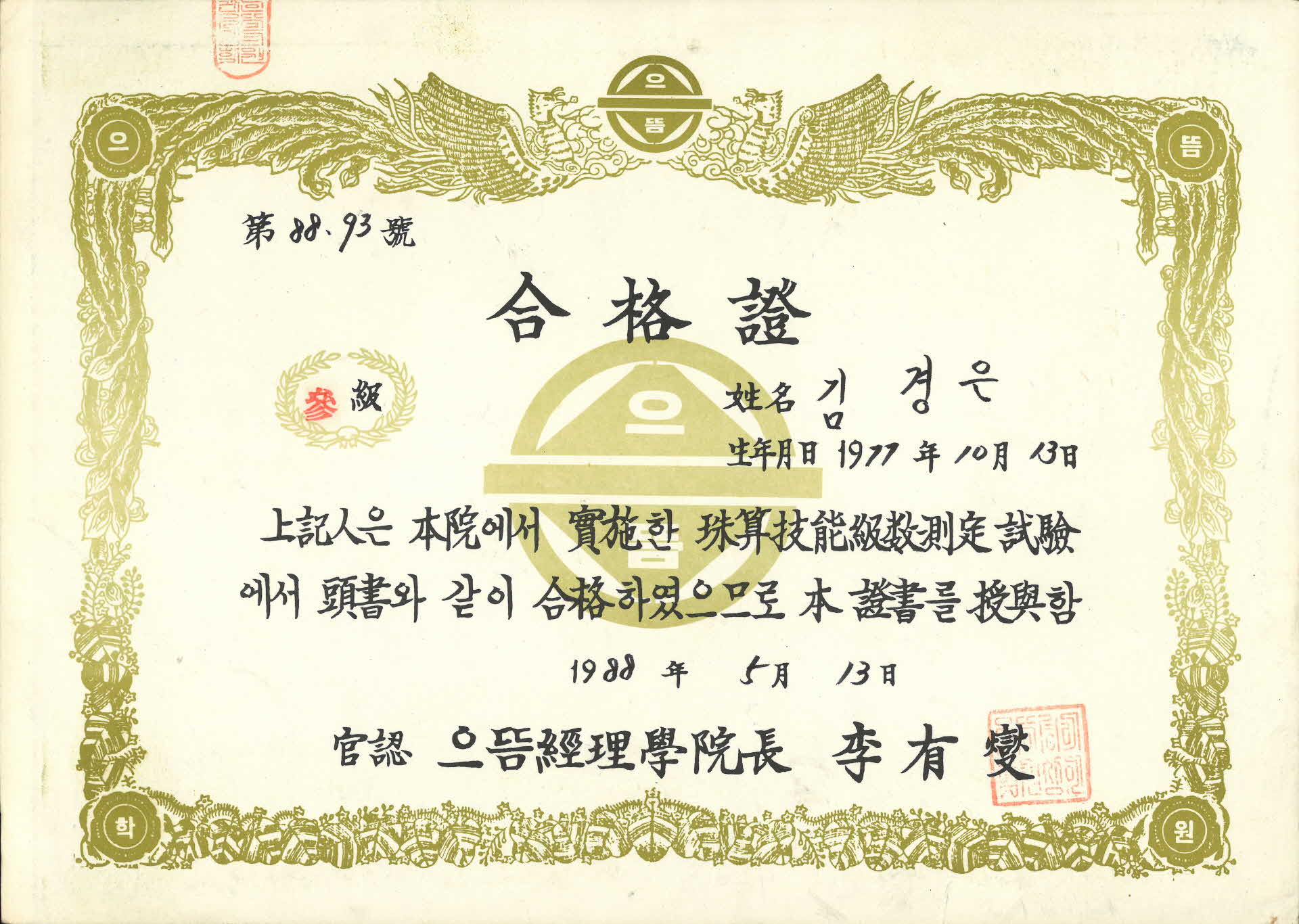 주산기능급수 측정시험 합격증 > 영주, 영주사람