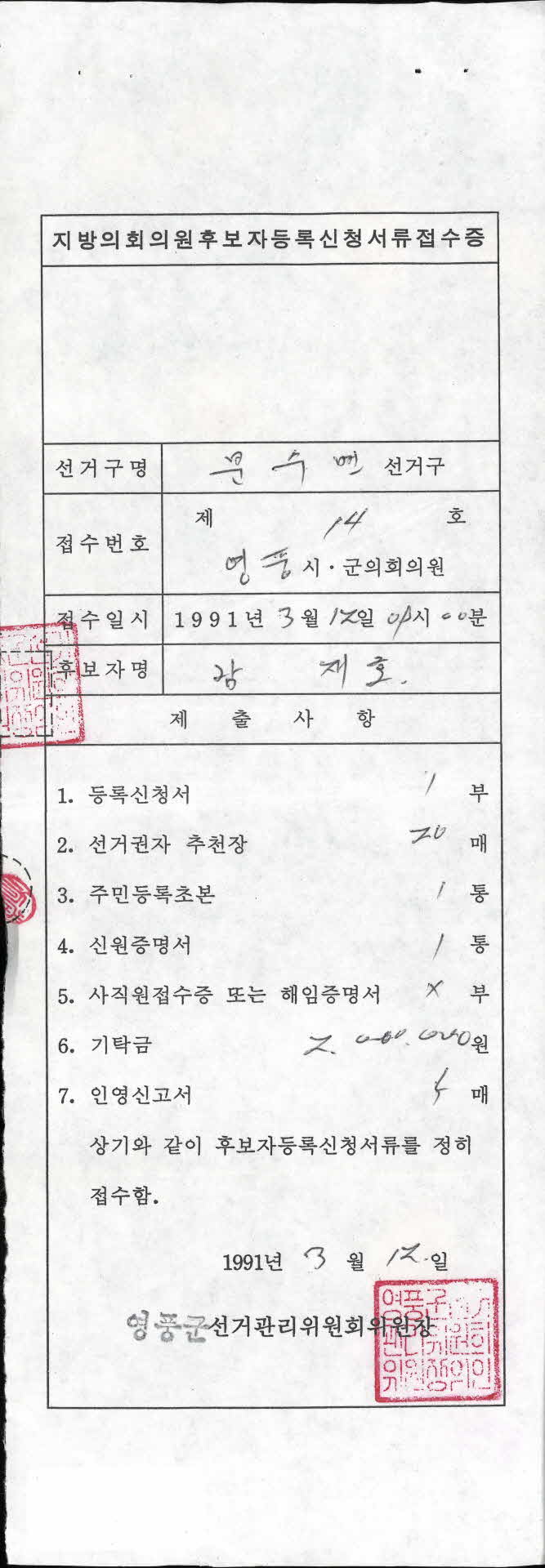 | 기록물명 | 지방의회의원후보자등록신청서류접수증 | ||