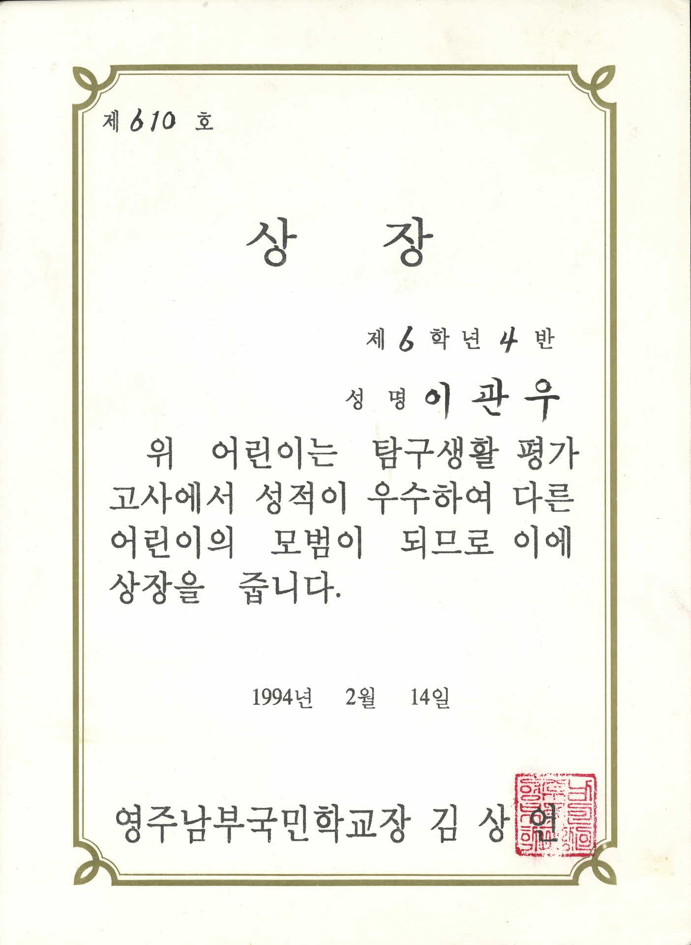 • 영주남부국민학교 탐구생활평가 우수 상장