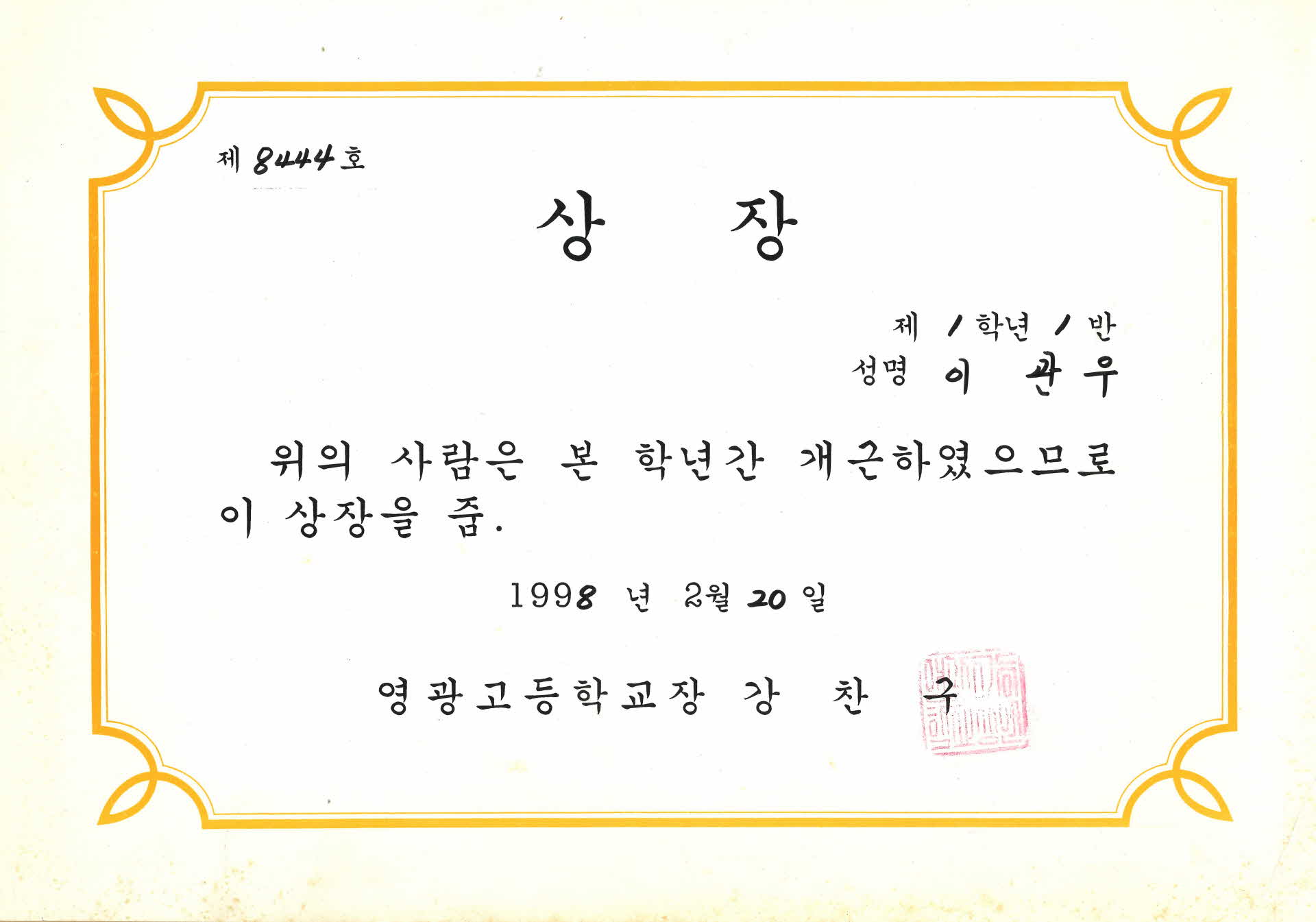 | 기록물명 | 1998년 영광고등학교 개근상 | ||