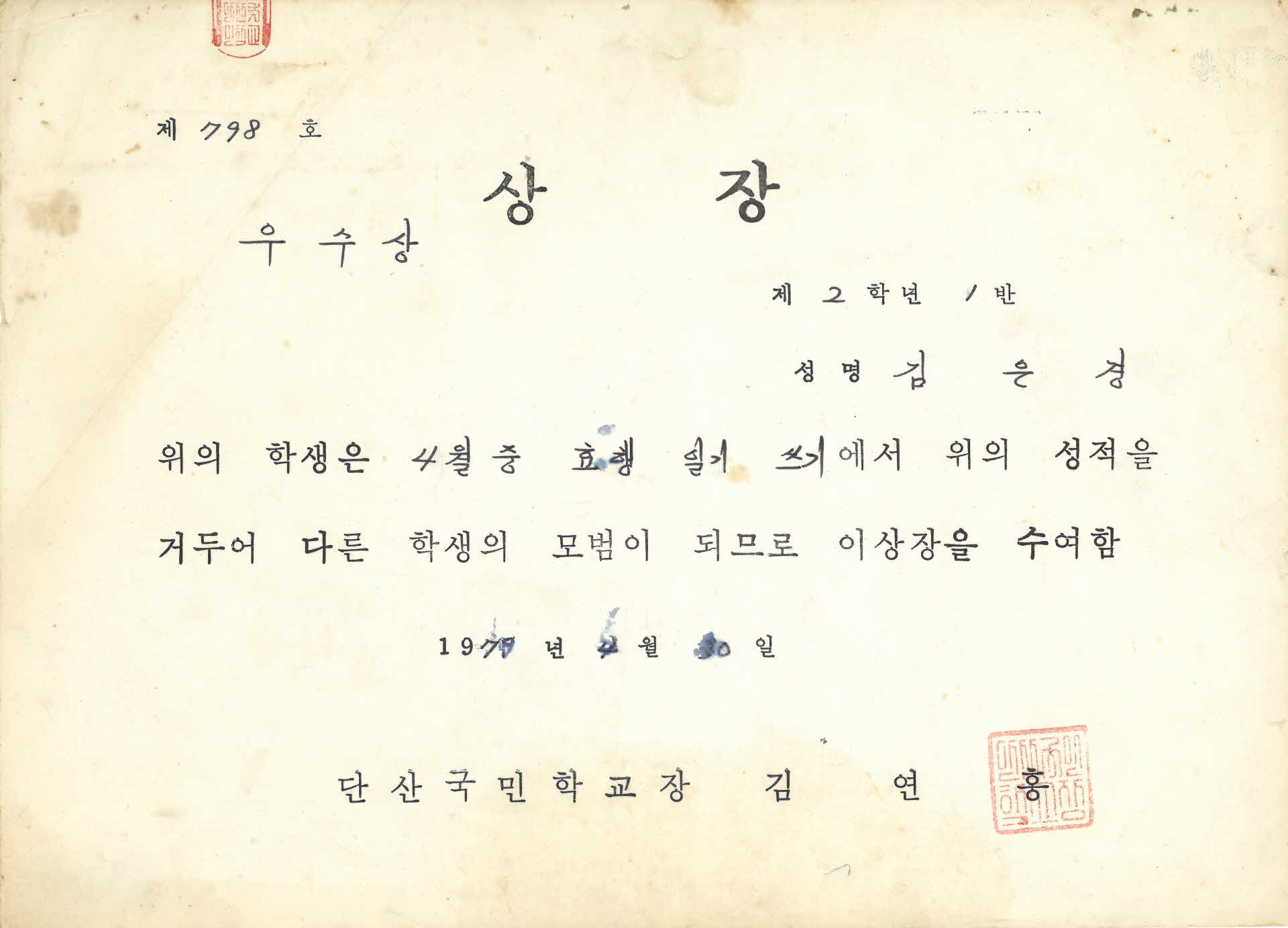 | 기록물명 | 1979년 단산국민학교 상장 | ||