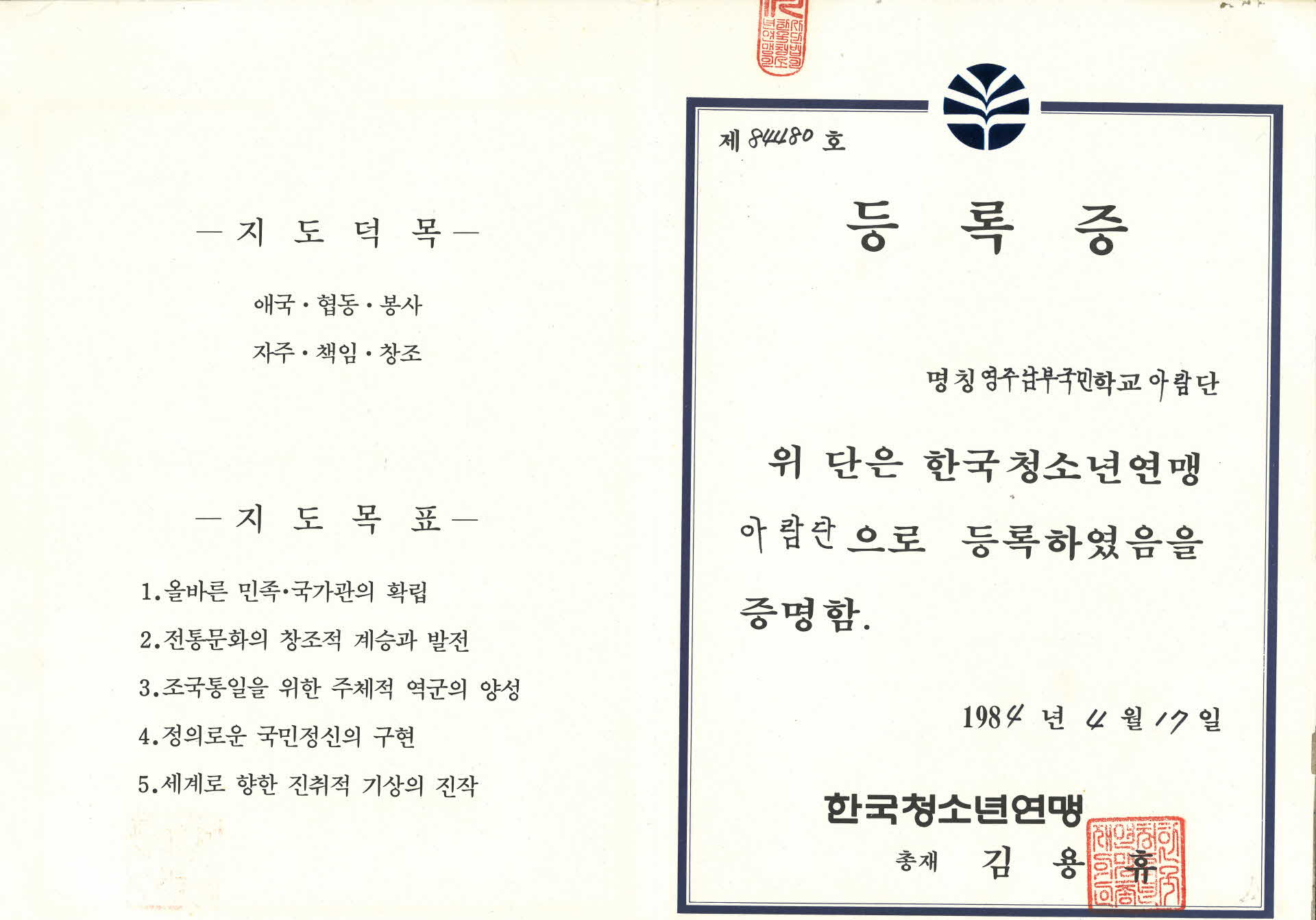 | 기록물명 | 1984년 한국청소년연맹 전임지도자 연수과정 수료증 | ||