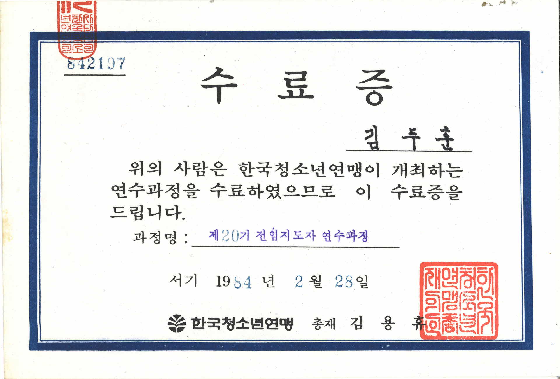 1984년 영주남부국민학교 아람단 등록증
