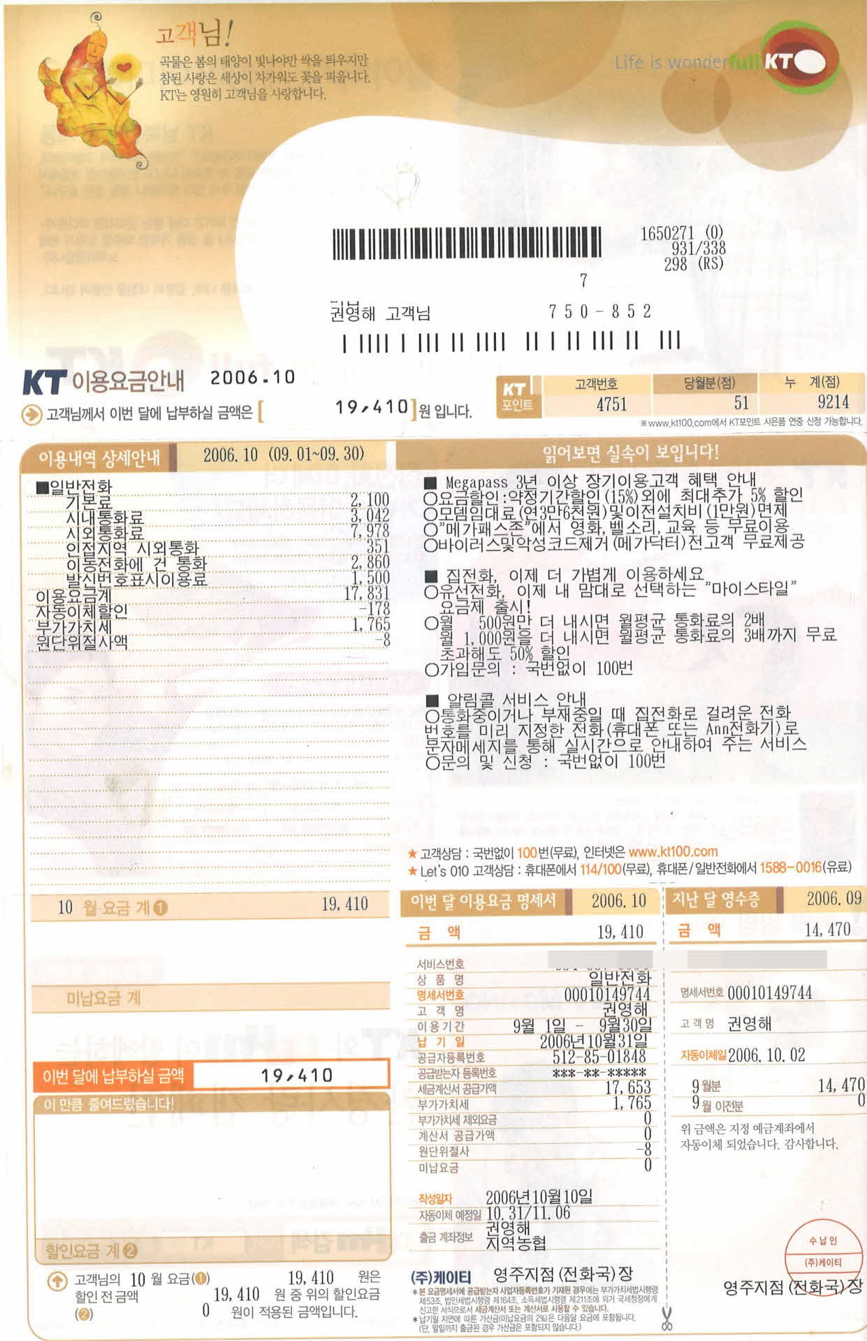 | 기록물명 | 10월 KT자동납부청구서 | ||