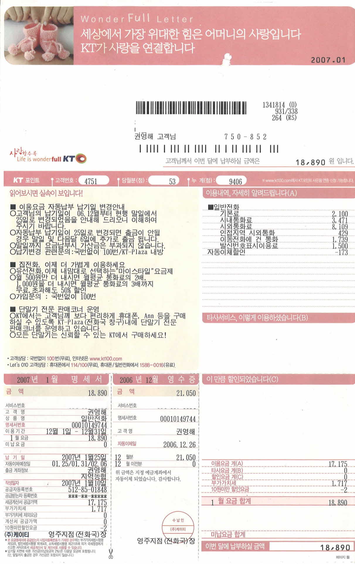 1월 KT자동납부청구서