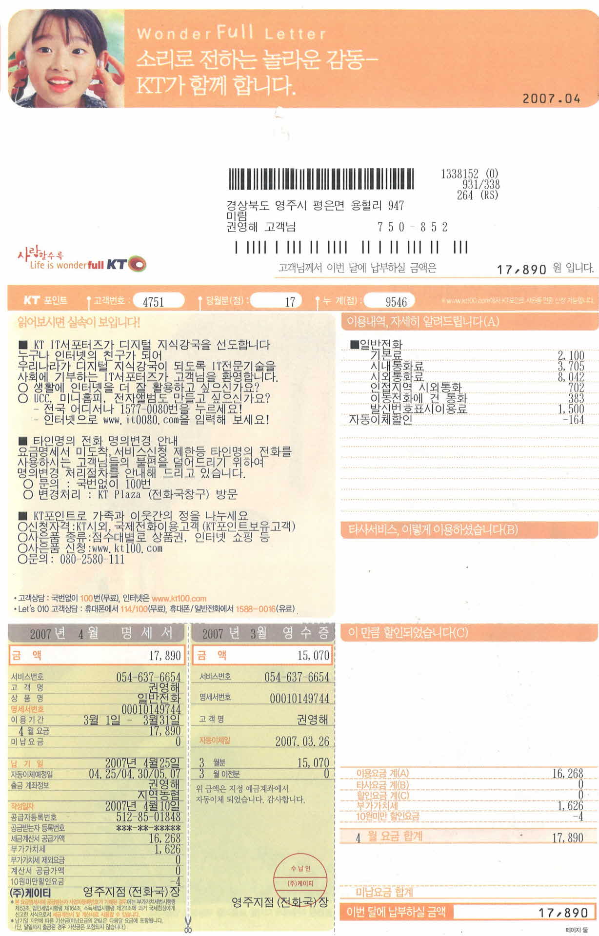 4월 KT자동납부청구서 > 영주, 영주사람