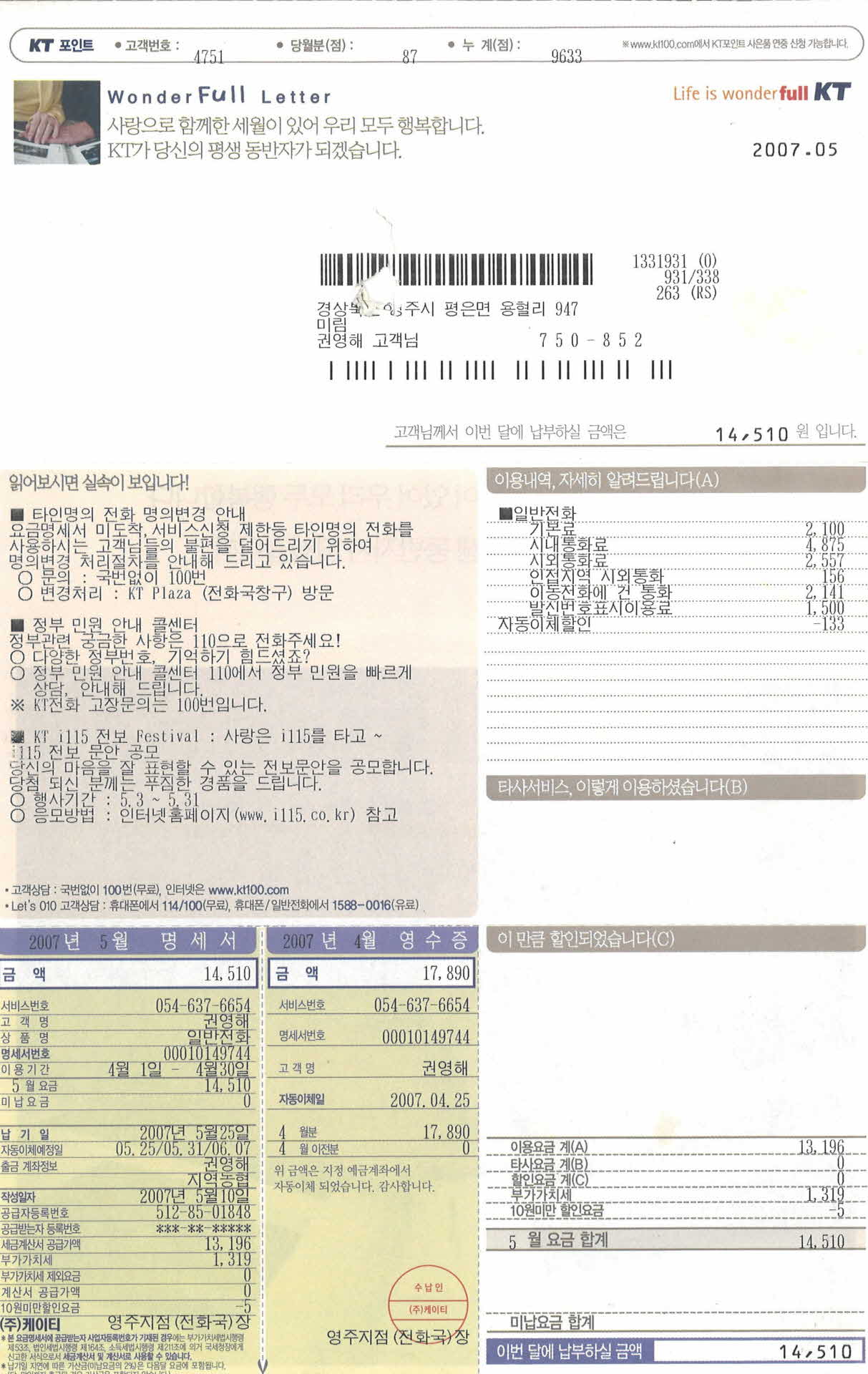 | 기록물명 | 5월 KT자동납부청구서 | ||