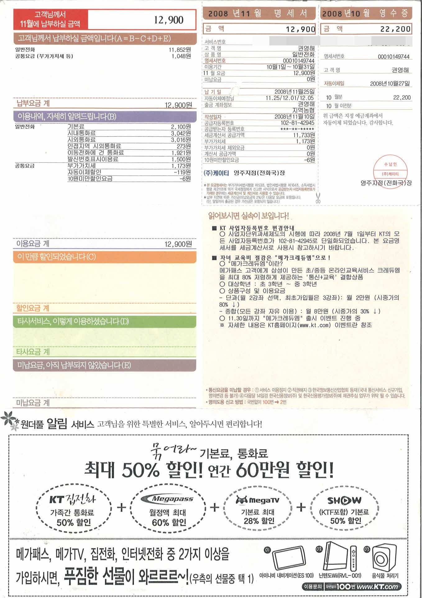 11월 KT자동납부청구서
