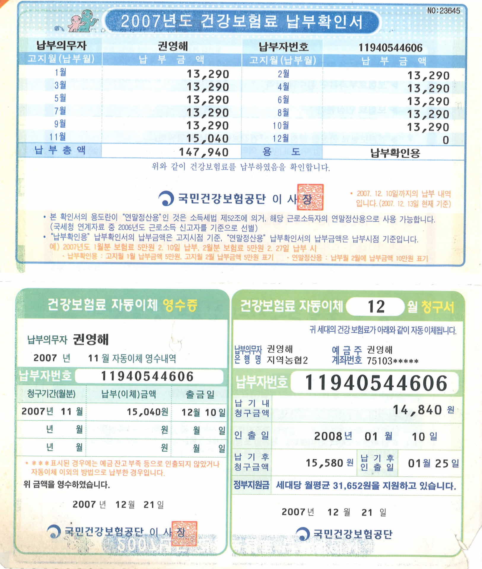 2007년도 건강보험료 납부확인서