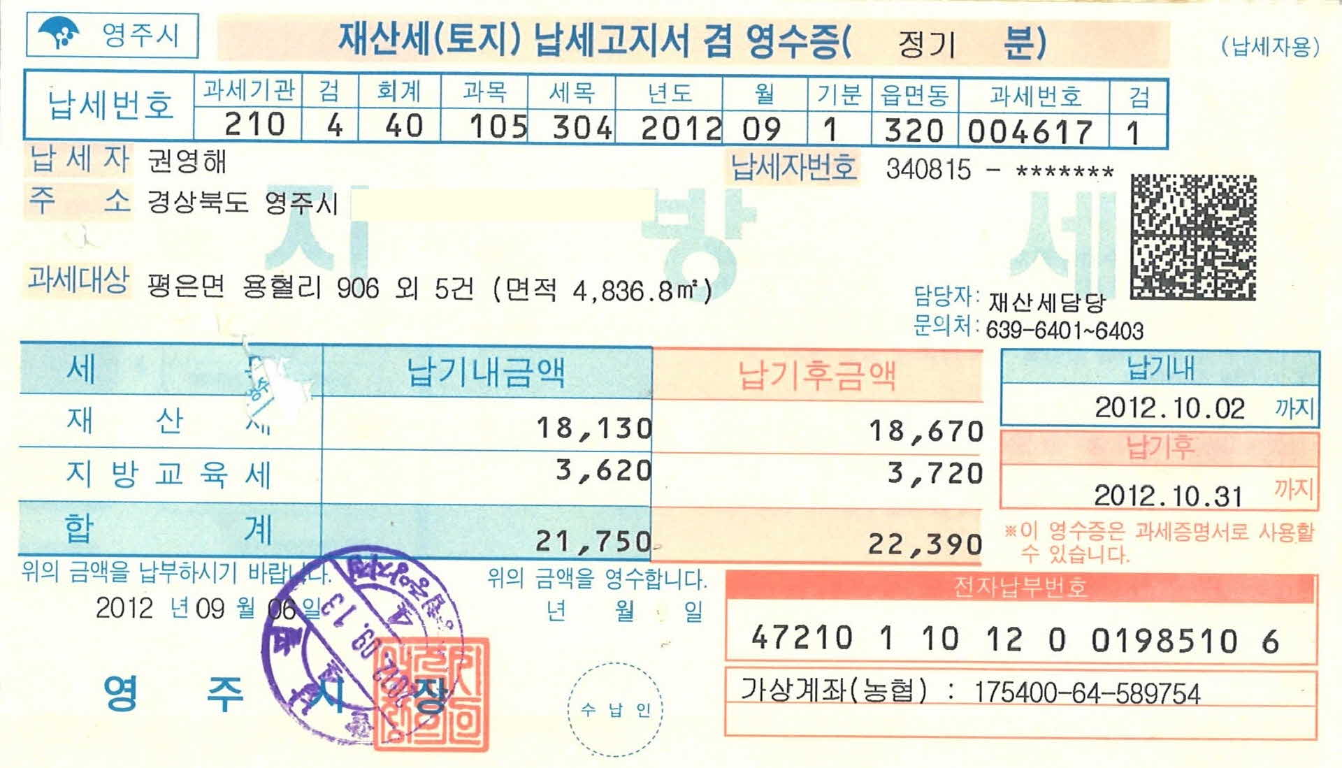 | 기록물명 | 재산세(토지) 남세고지서 겸 영수증 | ||