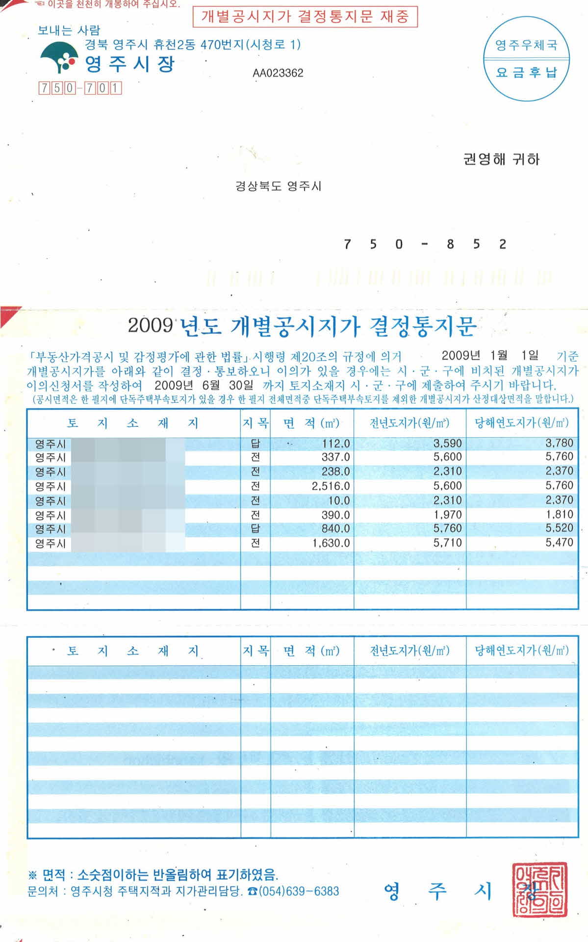 | 기록물명 | 2009년도 개별공시지가 결정통지문 | ||