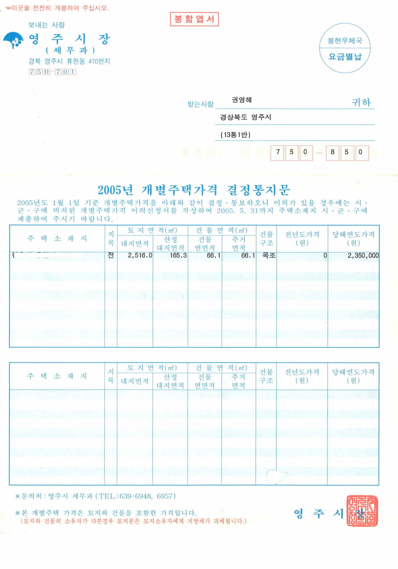 | 기록물명 | 2005년도 개별주택가격 결정통지문 | ||