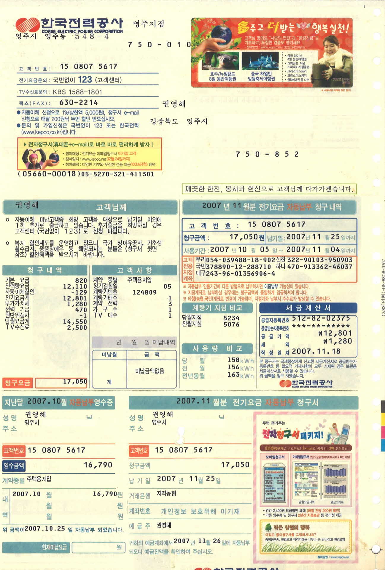 | 기록물명 | 2007년 11월분 전기요금 자동납부 청구내역 | ||