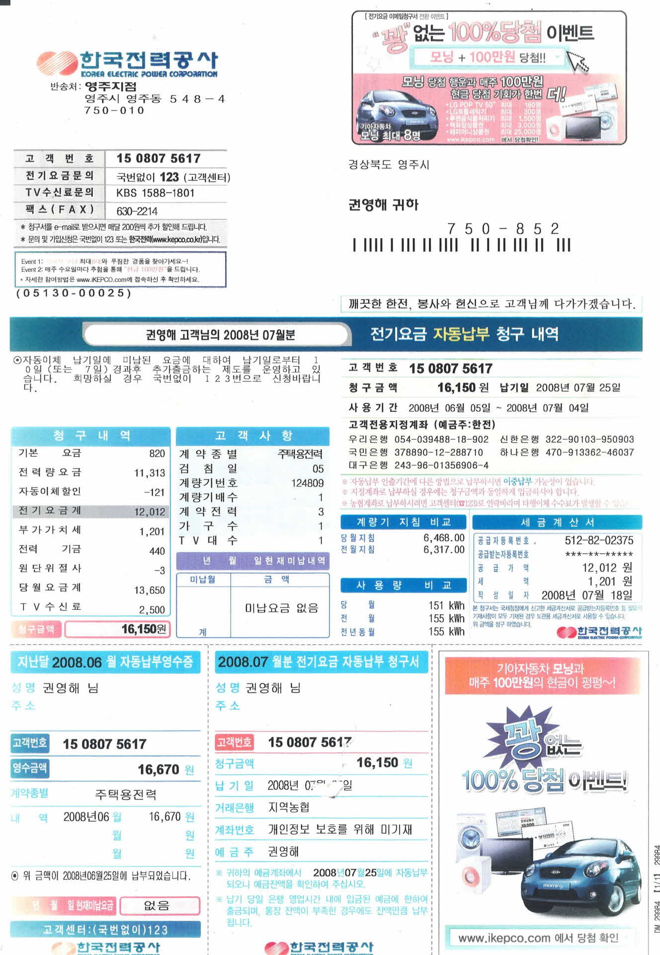 2008년 8월분 전기요금 자동납부 청구내역