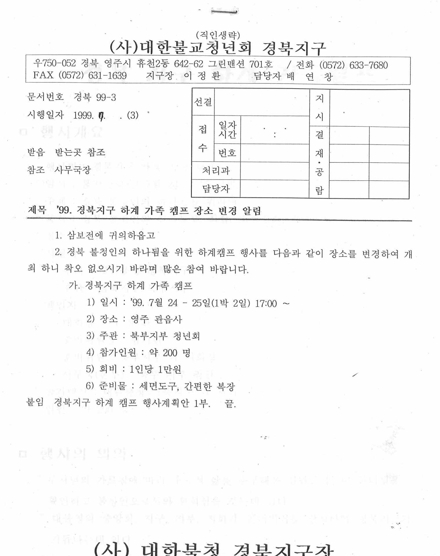 | 기록물명 | 1999년도 경북지구 하계 가족 캠프 장소 변경 알림 | ||
