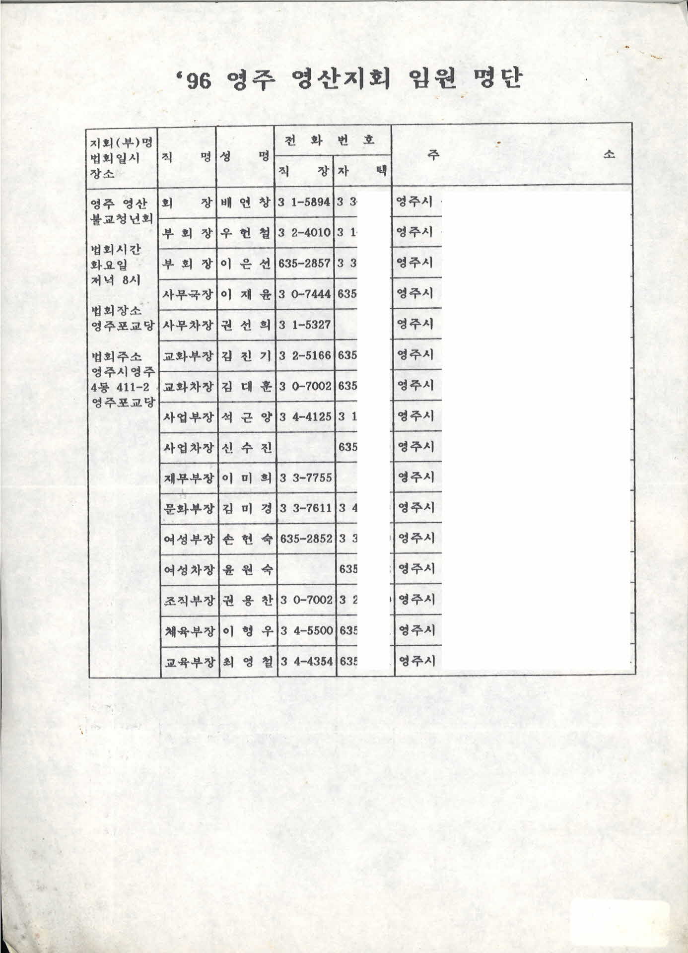 | 기록물명 | 1996년도 영주 영산지회 임원 명단 | ||