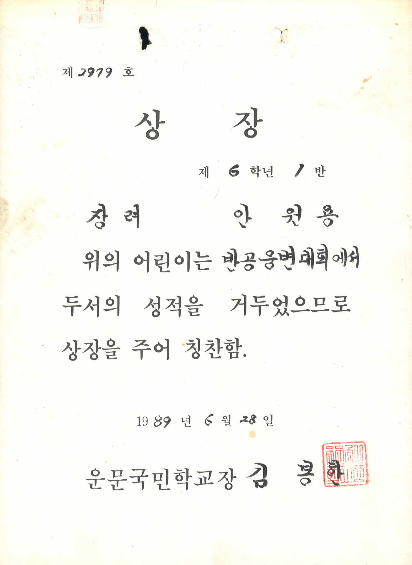 운문국민학교 상장 반공웅변대회