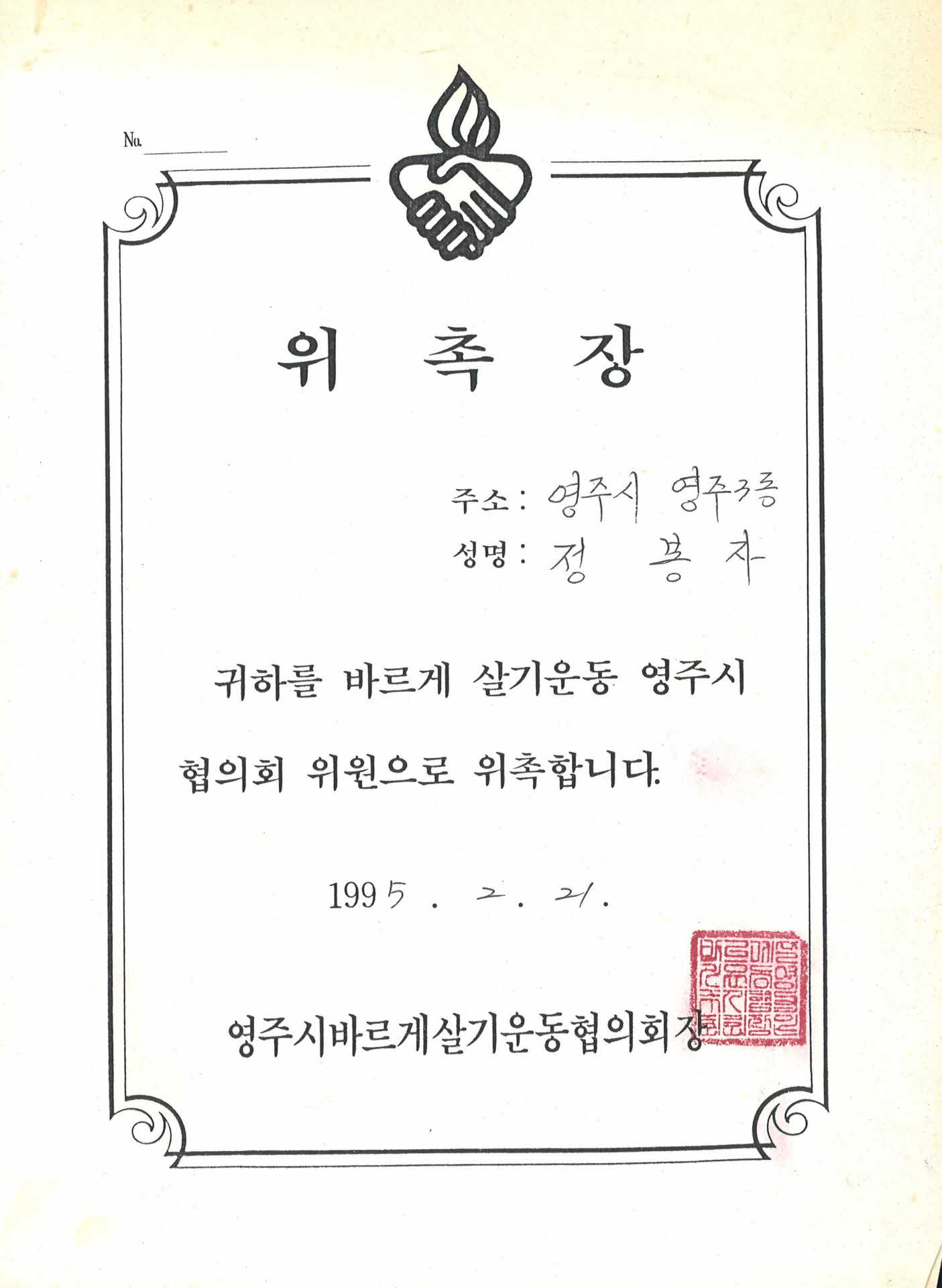 | 기록물명 | 1995년 바르게살기운동협의회 위촉장 | ||