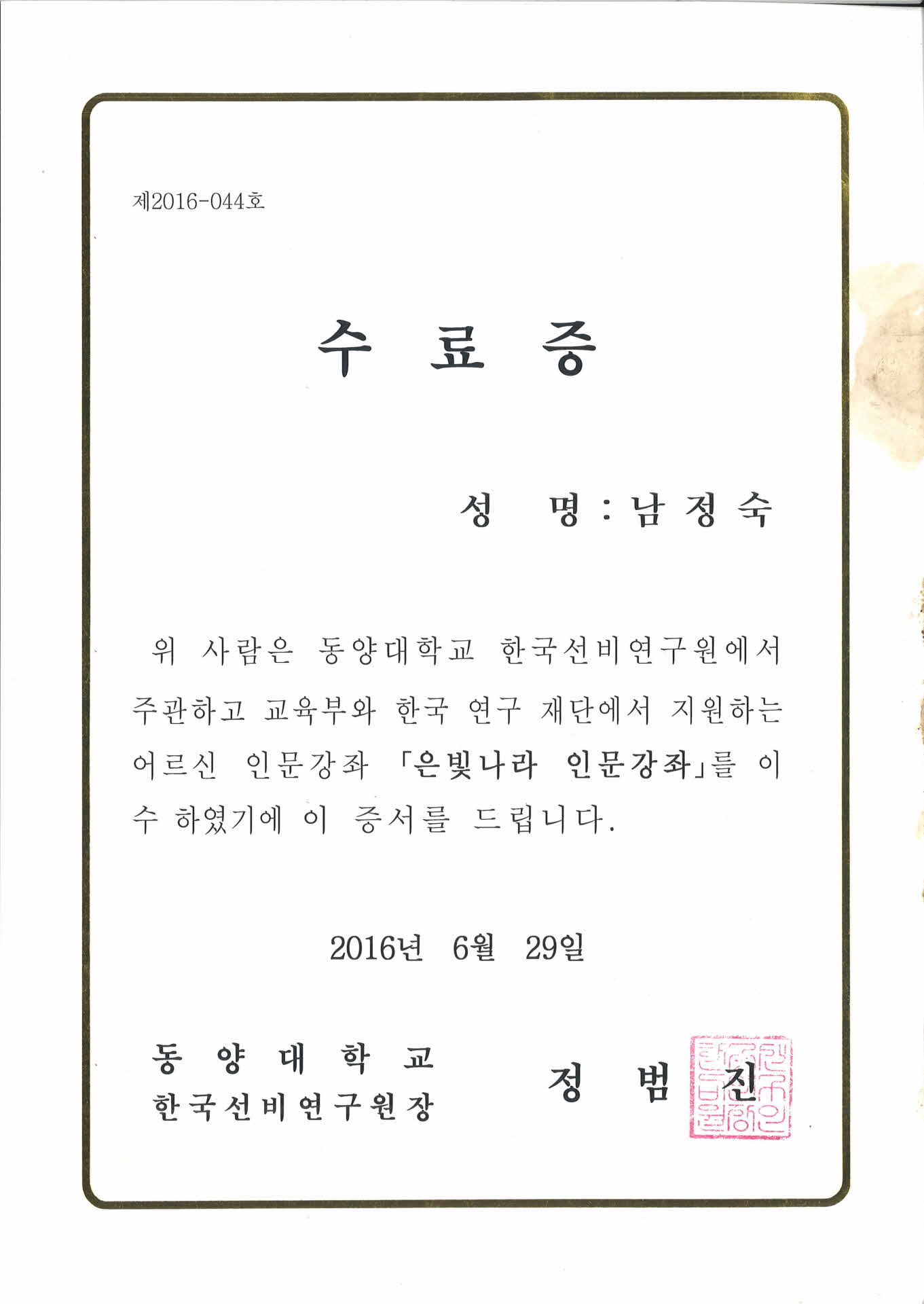 2016년 은빛나라 인문강좌 수료증