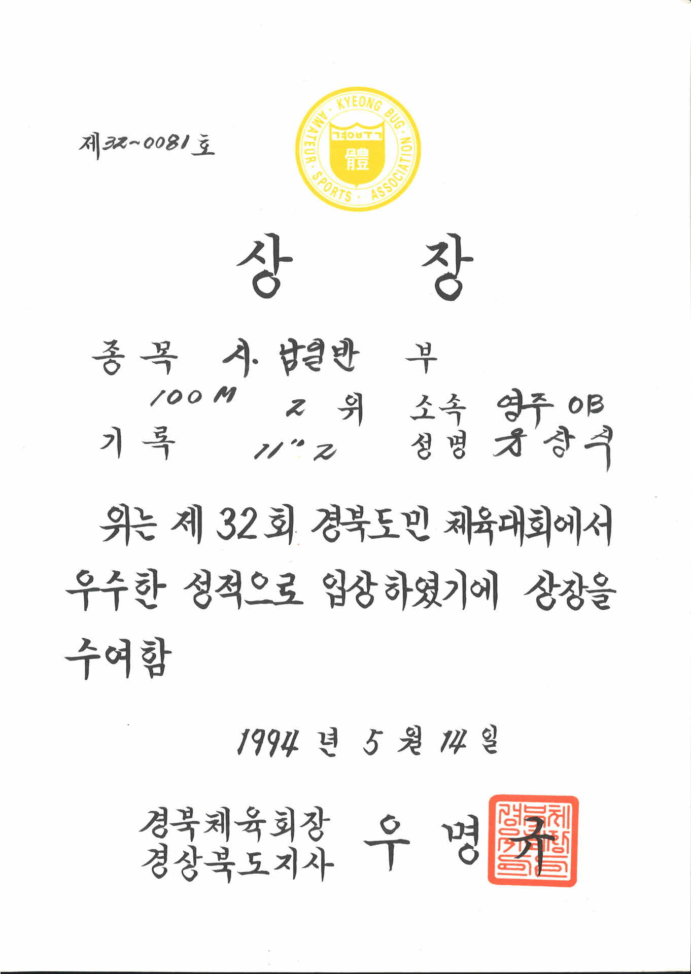 • 제 32회 경북도민체육대회 제 32-0081호 상장
