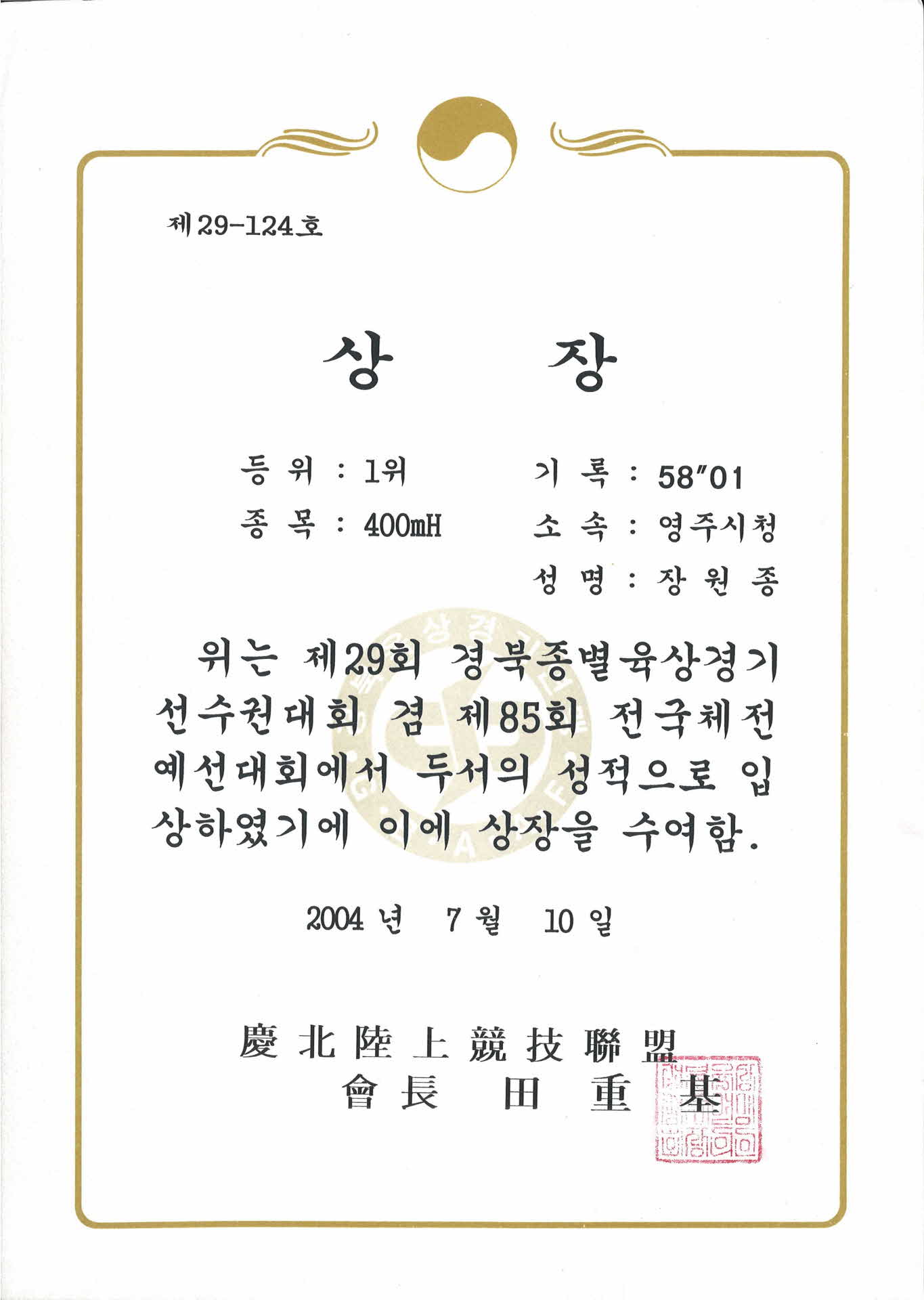 제 29회 경북종별육상경기 선수권대회 제29-124호 상장