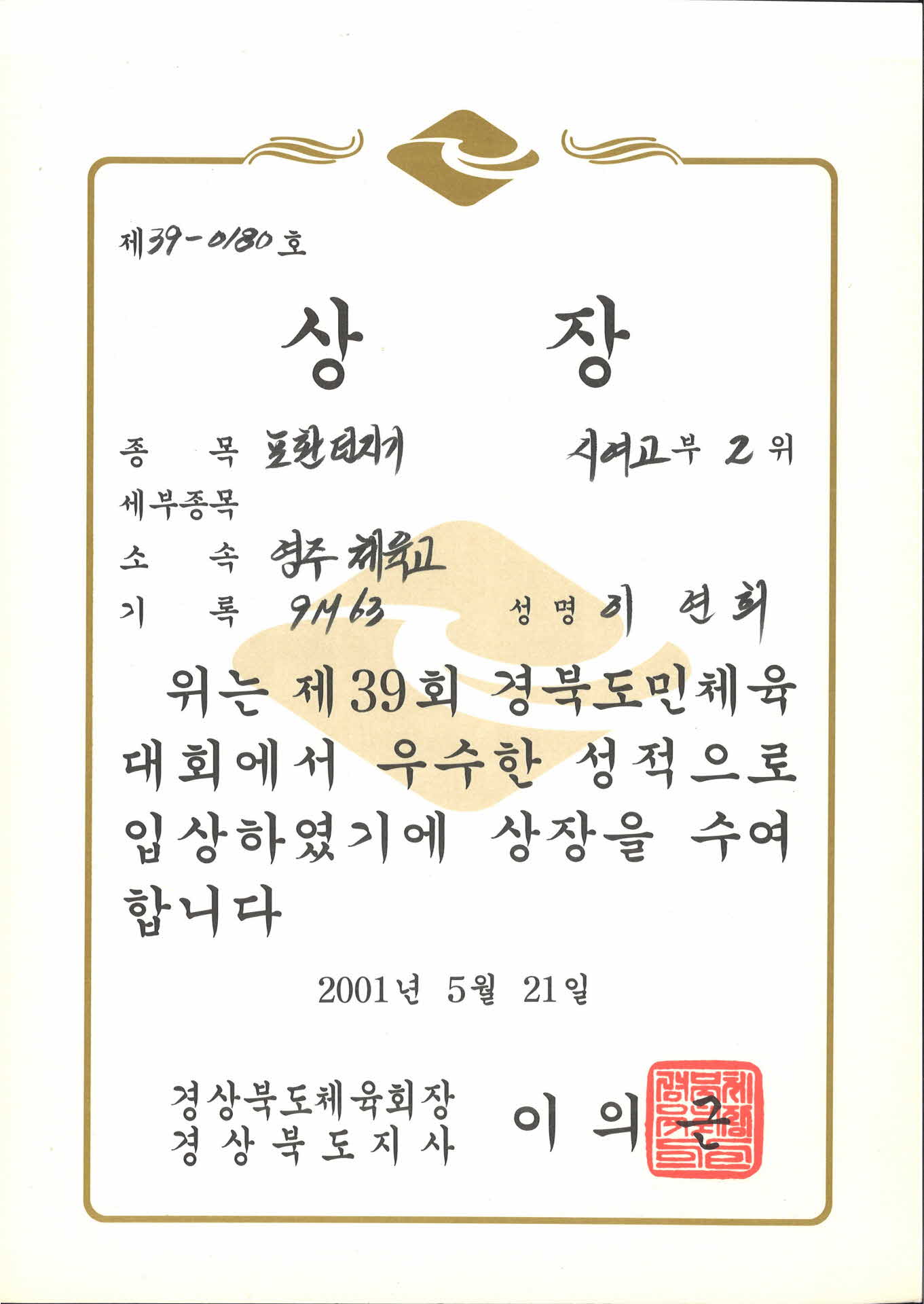 제 39회 경북도민체육대회 제 39-0180호 상장