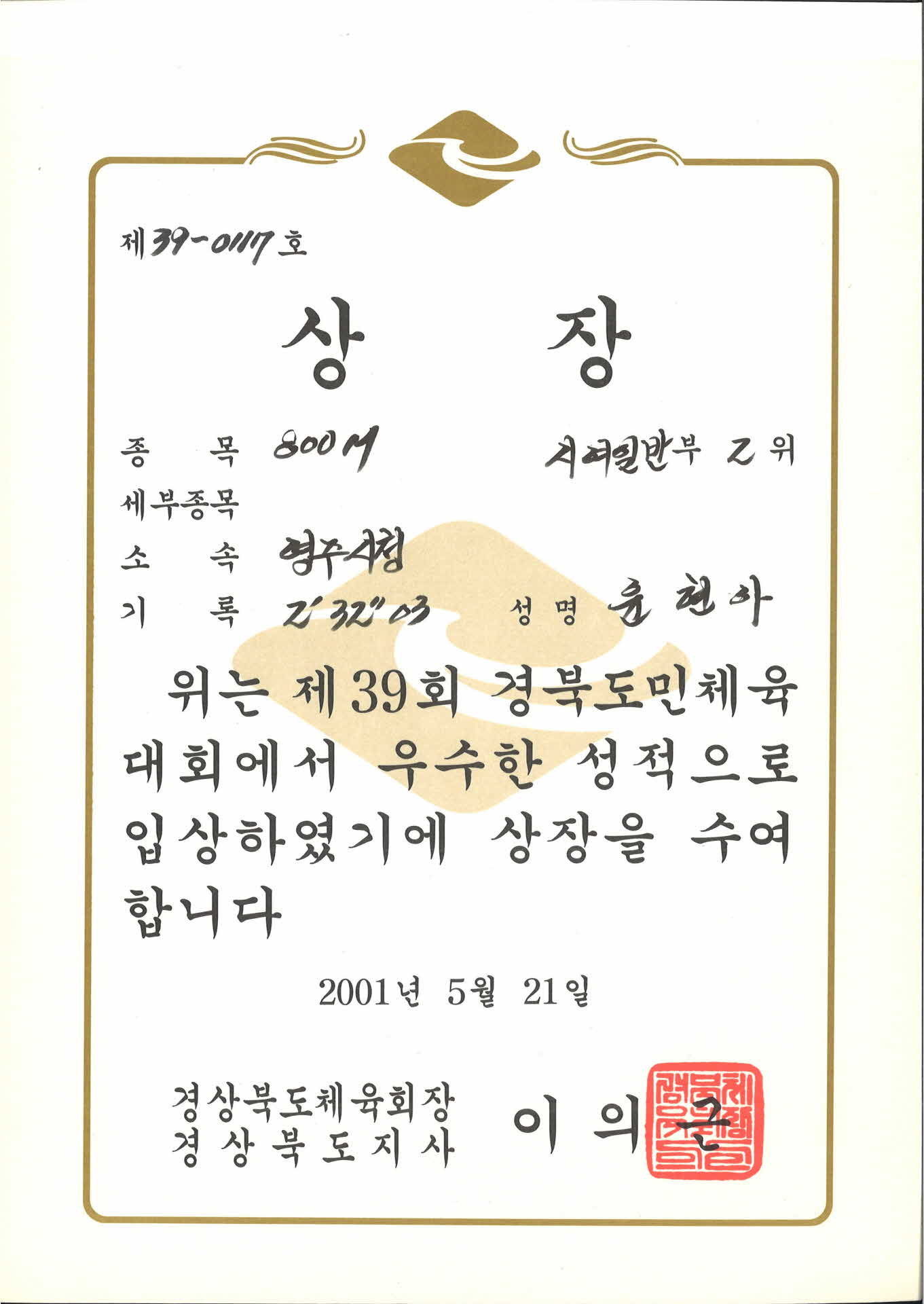 • 제 39회 경북도민체육대회 제 39-0117호 상장