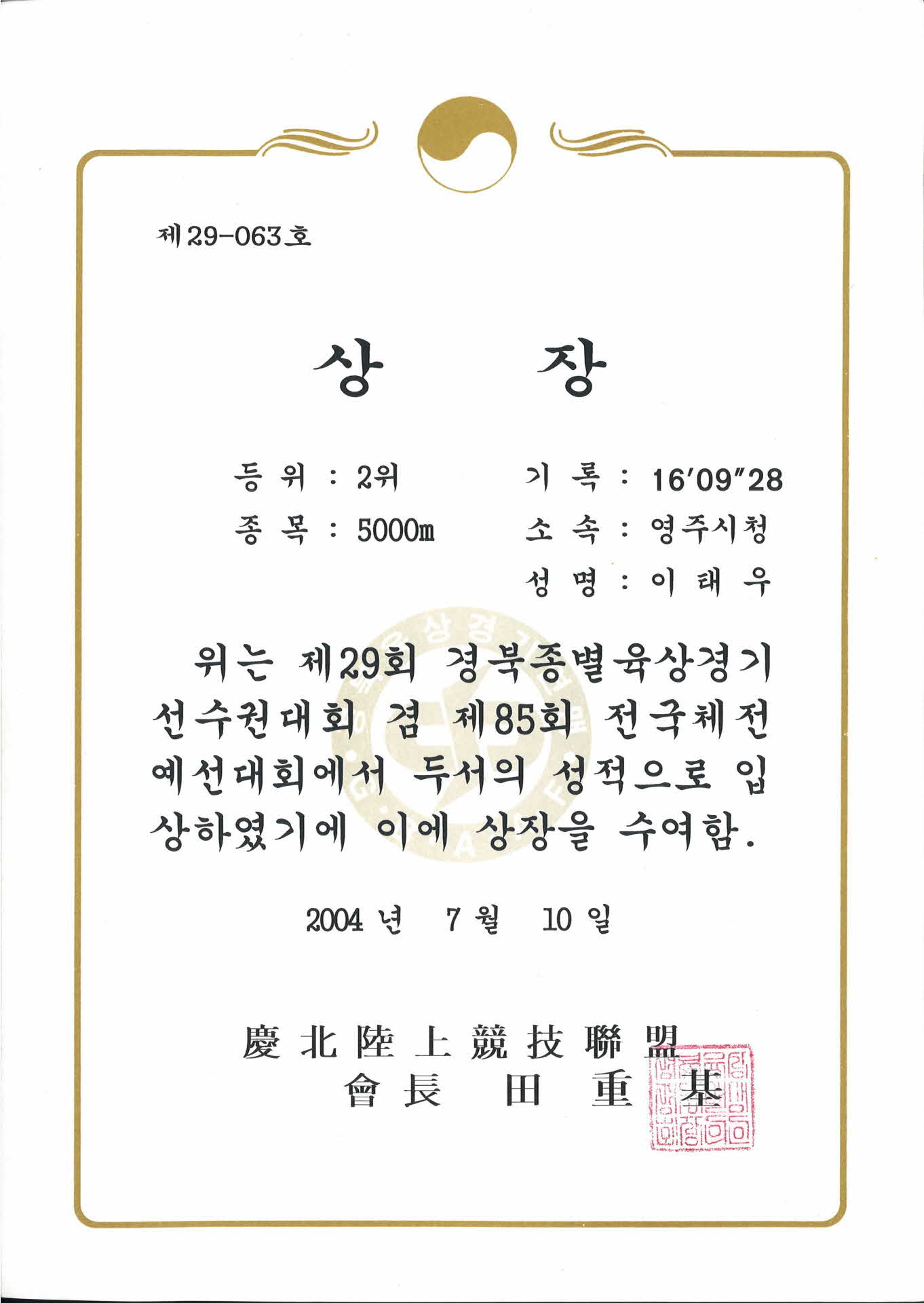 제 29회 경북종별육상경기 선수권대회 제 29-063호 상장