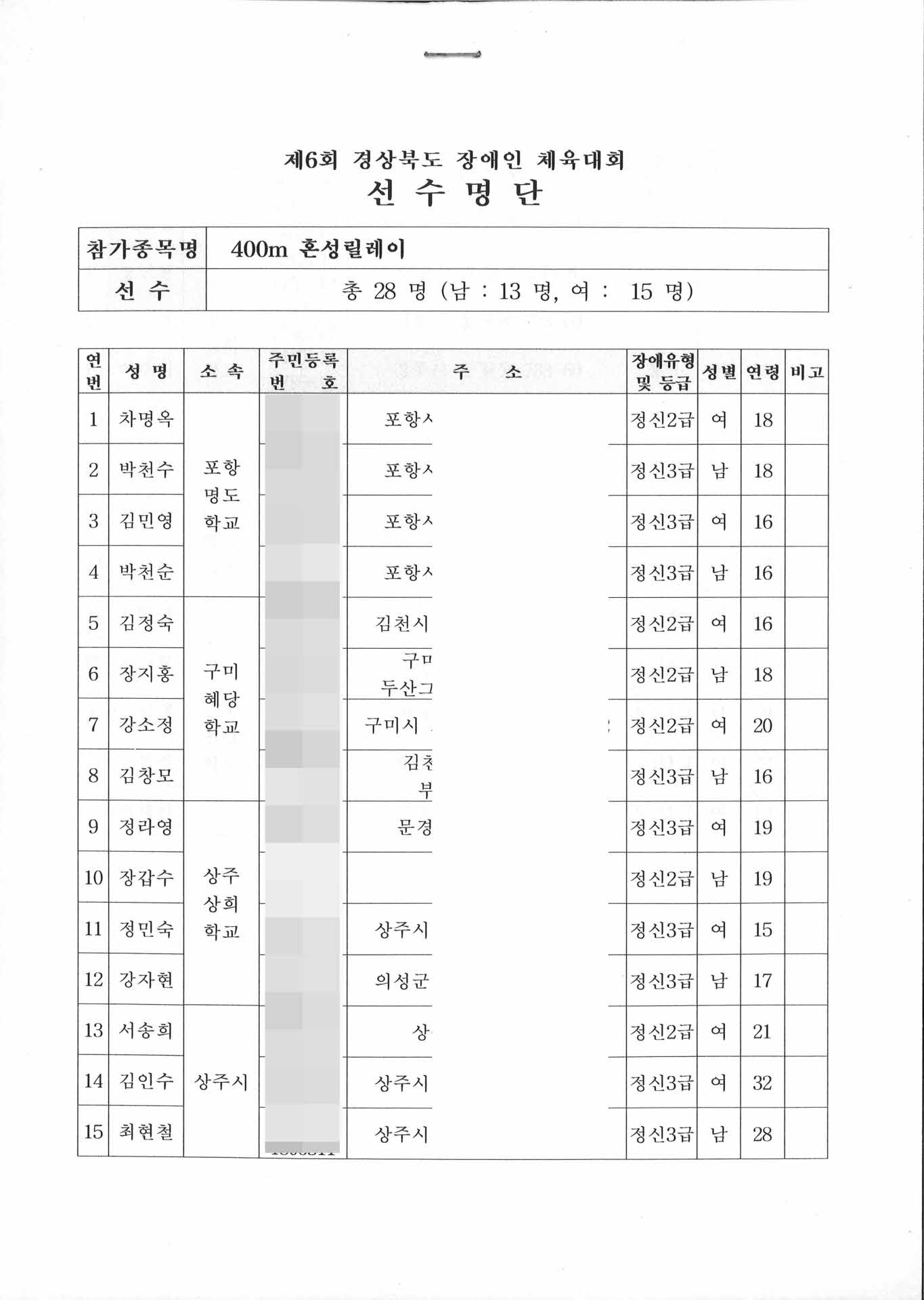 제6회 경북 장애인 체육대회 선수명단 400ㅡ혼성릴레이