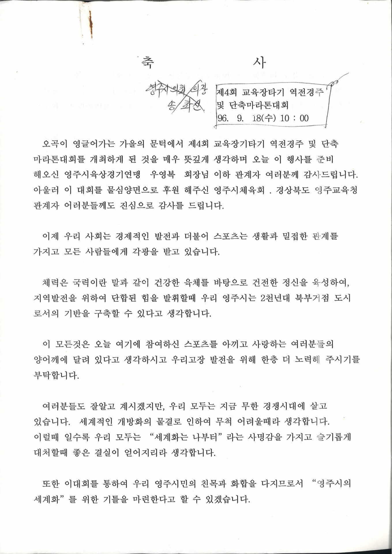 | 기록물명 | 축사 제4회 교육장기 타기 역전경주 및 단축마라톤 대회 | ||