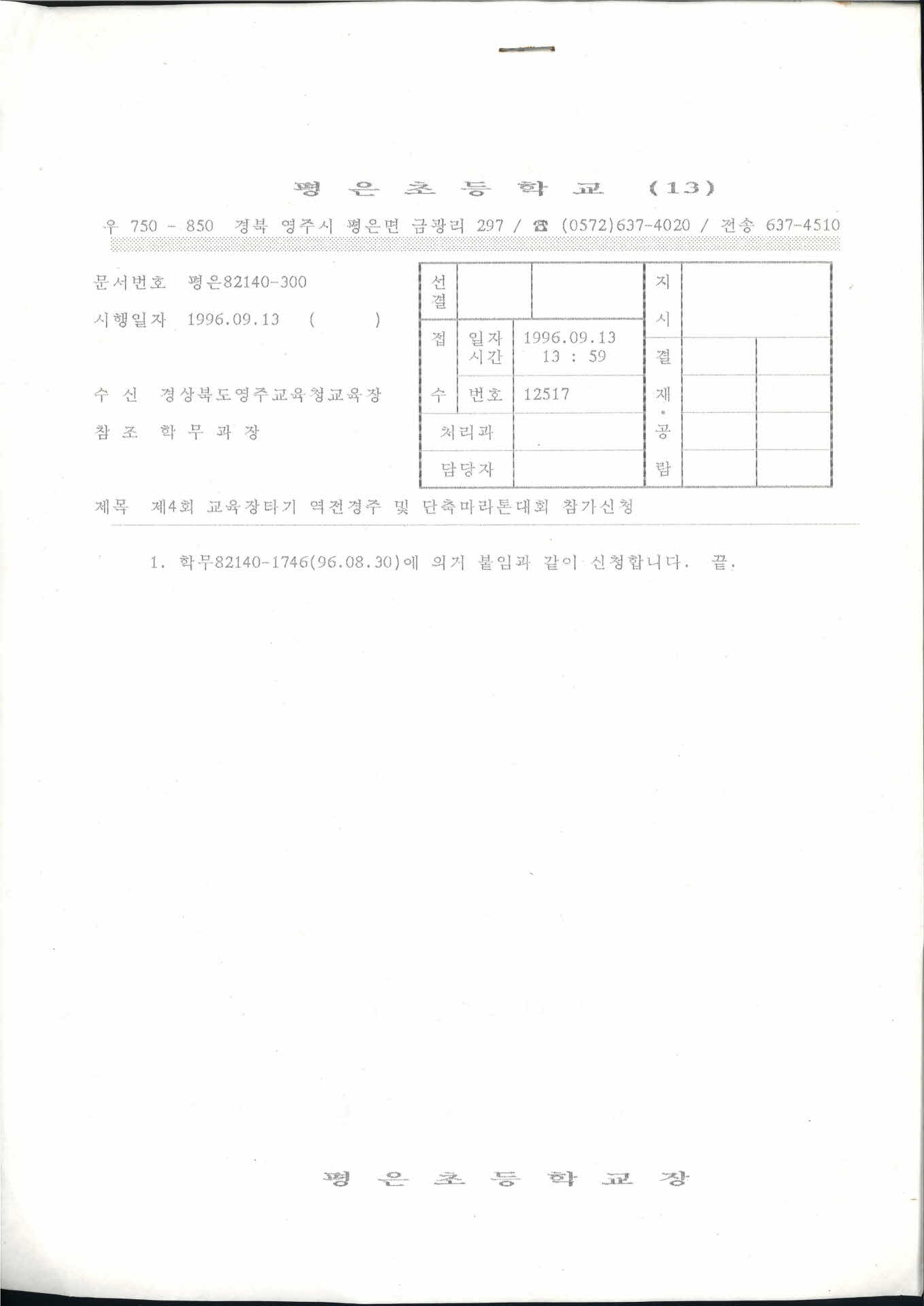 | 기록물명 | 평은초등학교 역전경부 및 단축마라톤 대회 참가신청 | ||