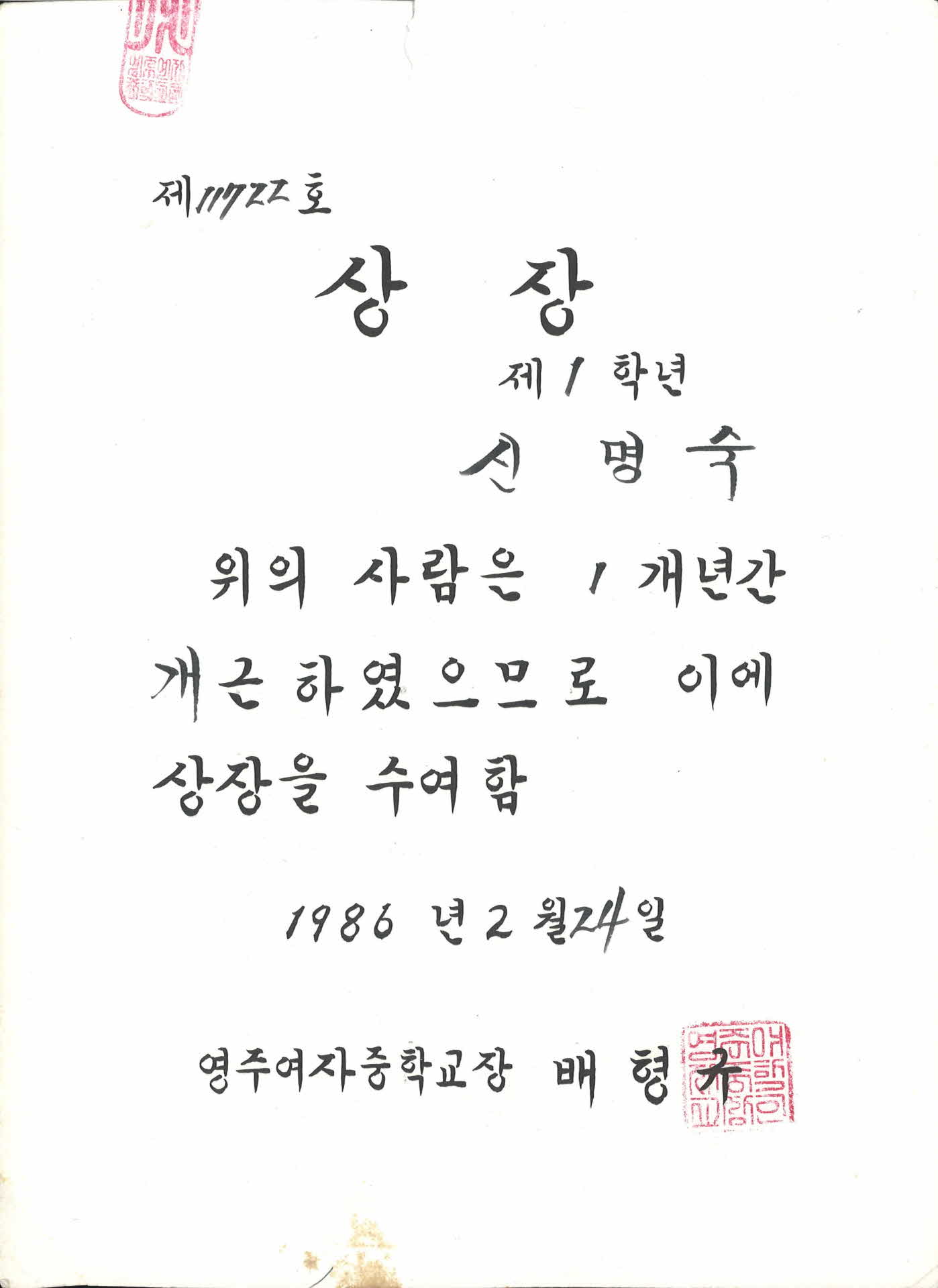 1986년 영주여자중학교 상장 > 영주, 영주사람