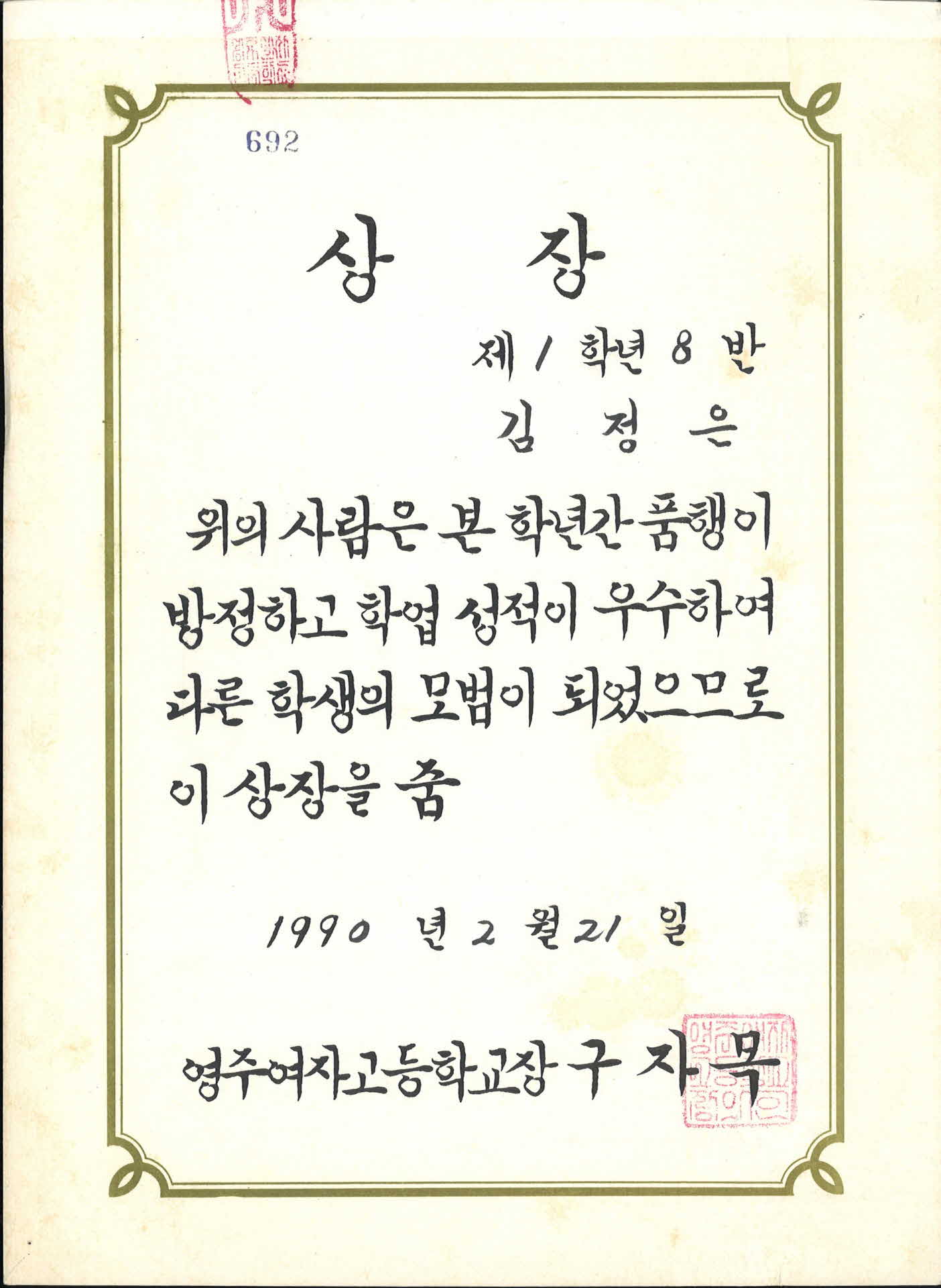 1990년 영주여자중학교 학업성적 우수 상장