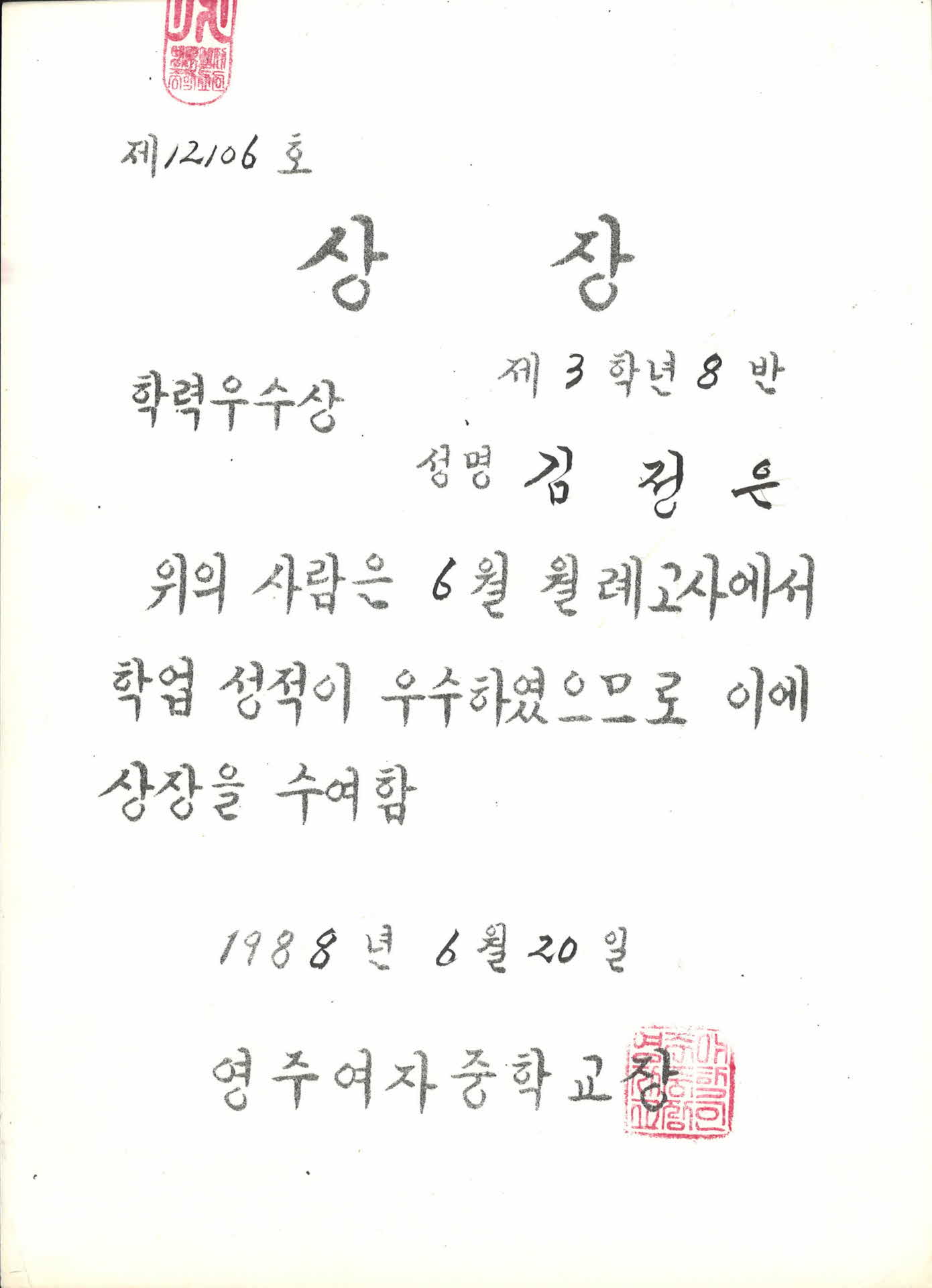 1988년 영주여자중학교 학력우수상 상장