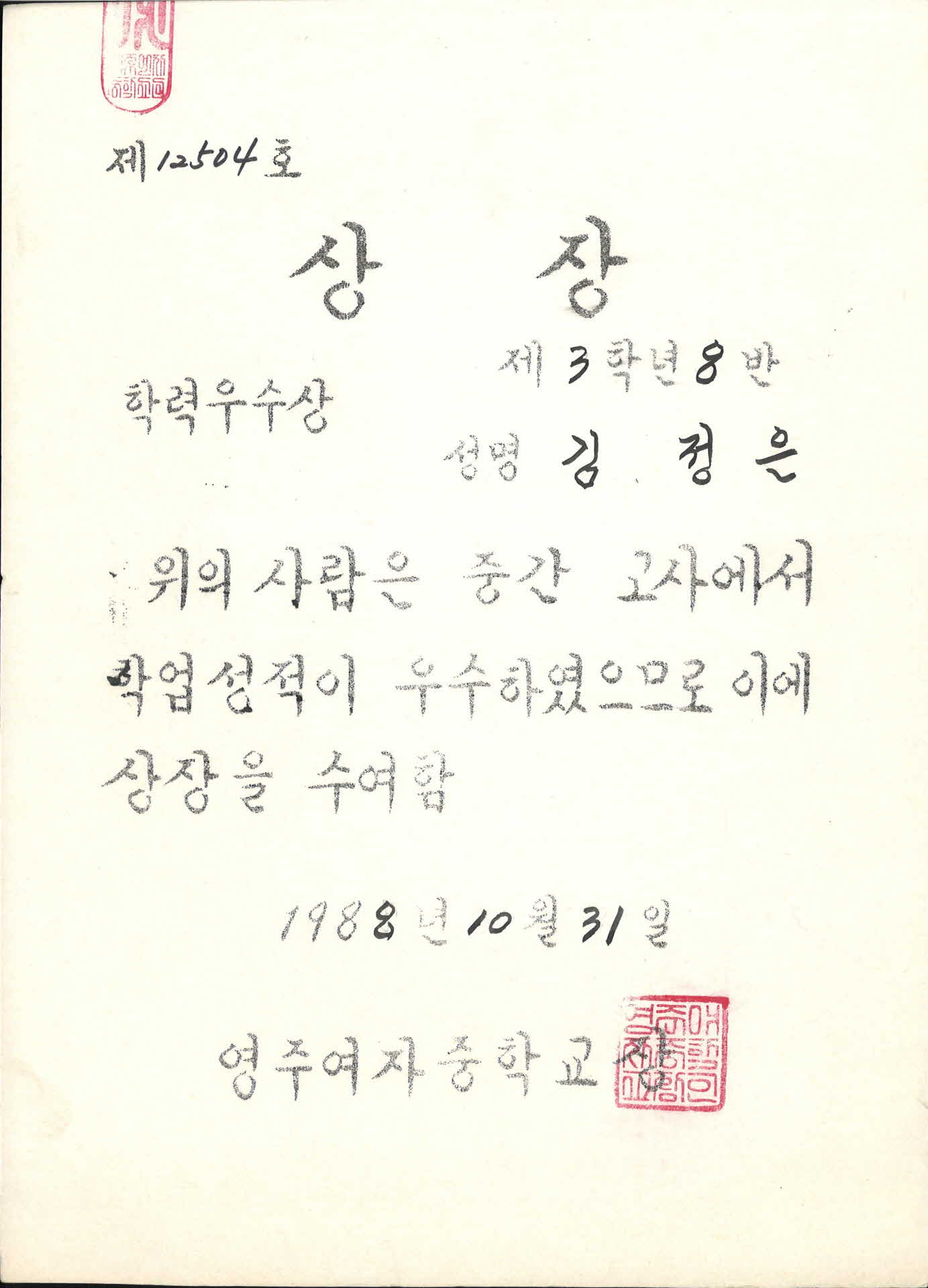 1988년 영주여자중학교 학력우수상 상장