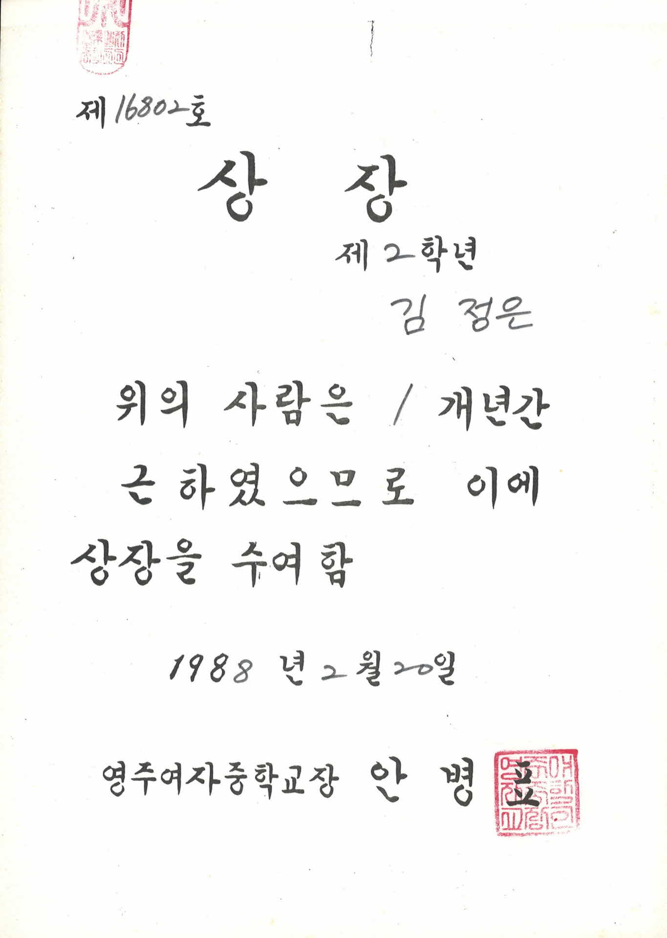 • 1988년 영주여자중학교 1년 개근 상장
