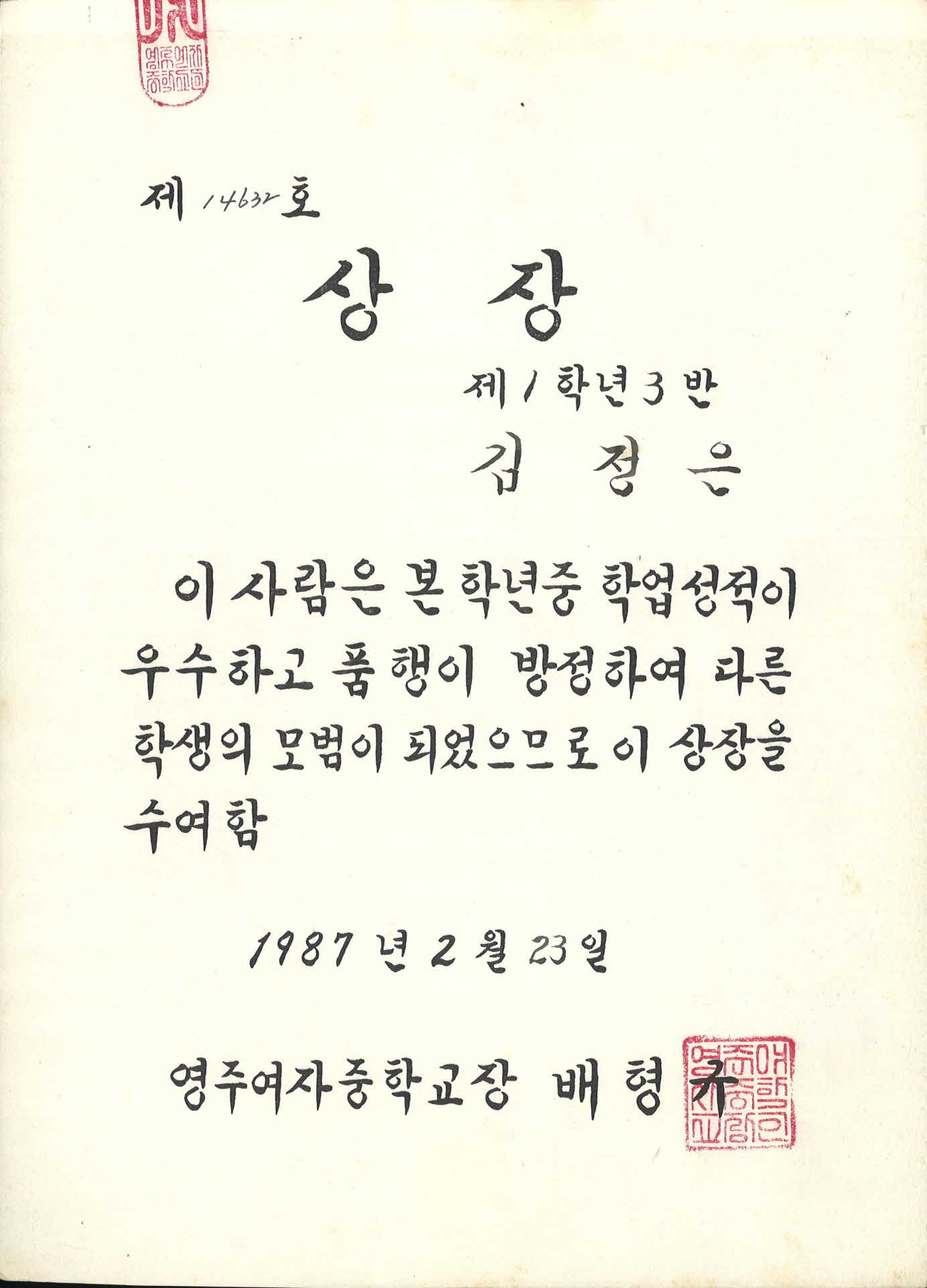 1987년 영주여자중학교 배형규 상장