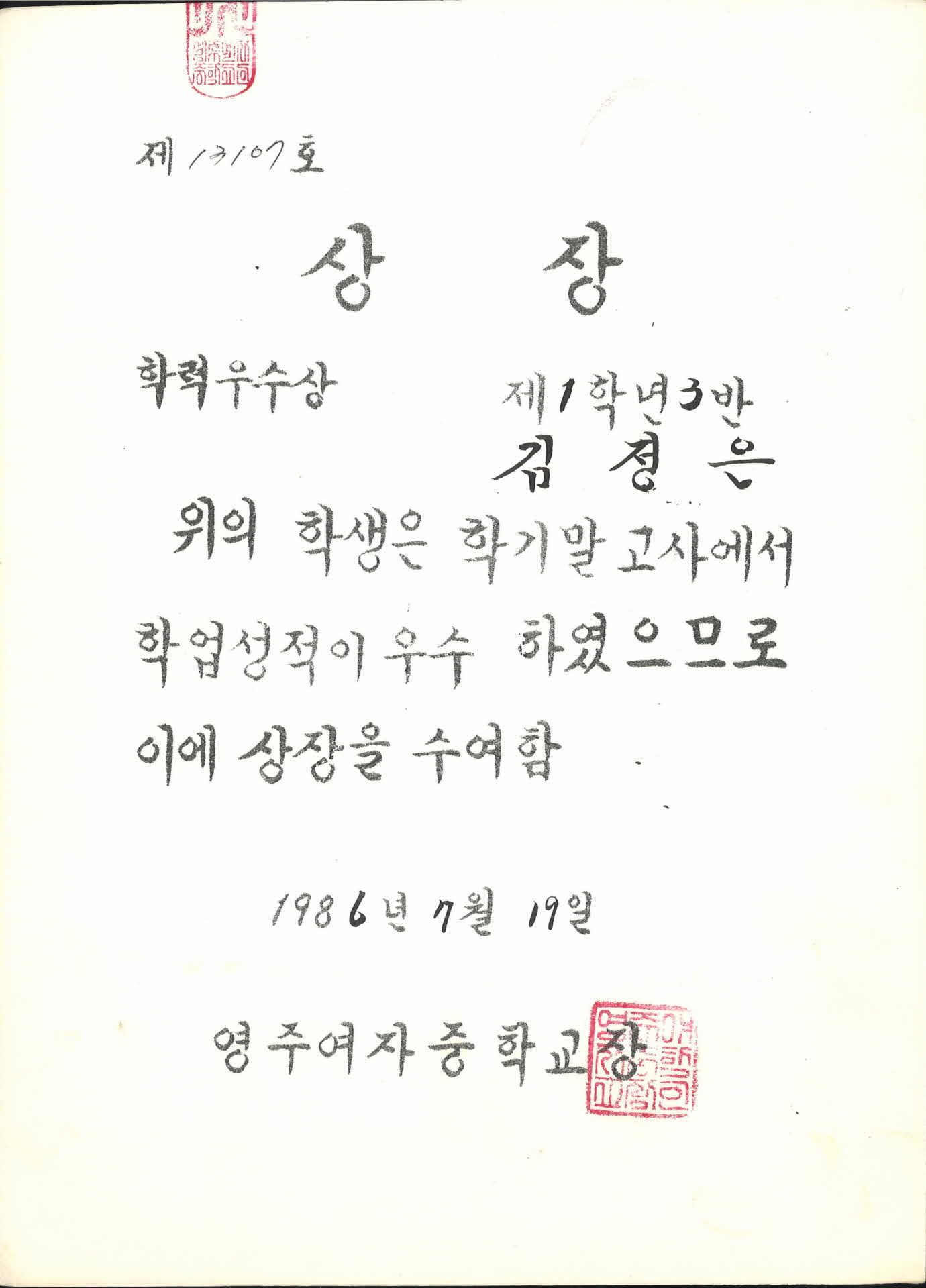 1986년 영주여자중학교 학업성적우수 상장