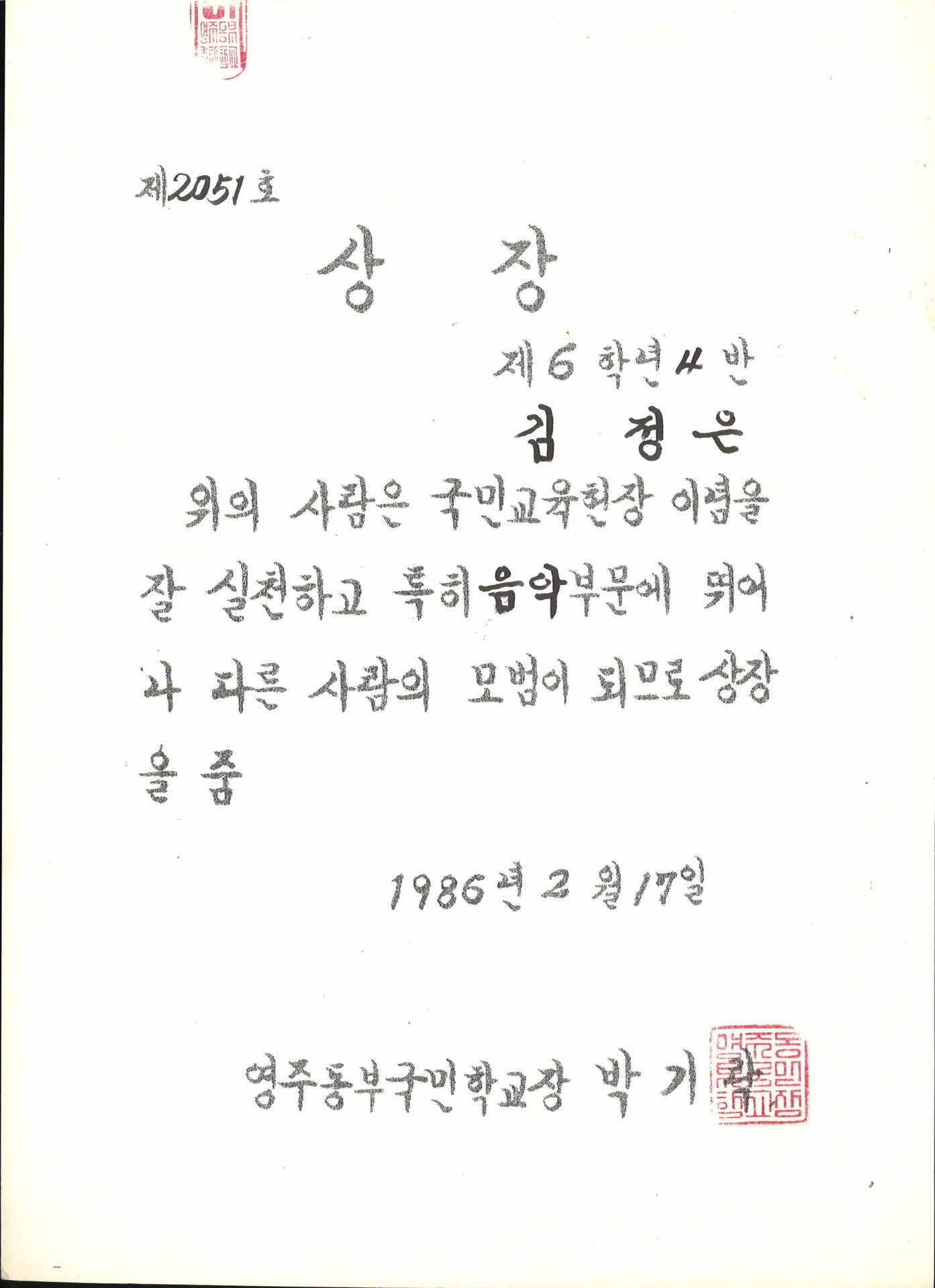 1986년 영주동부국민학교 국민교육헌장 실천 우수 상장