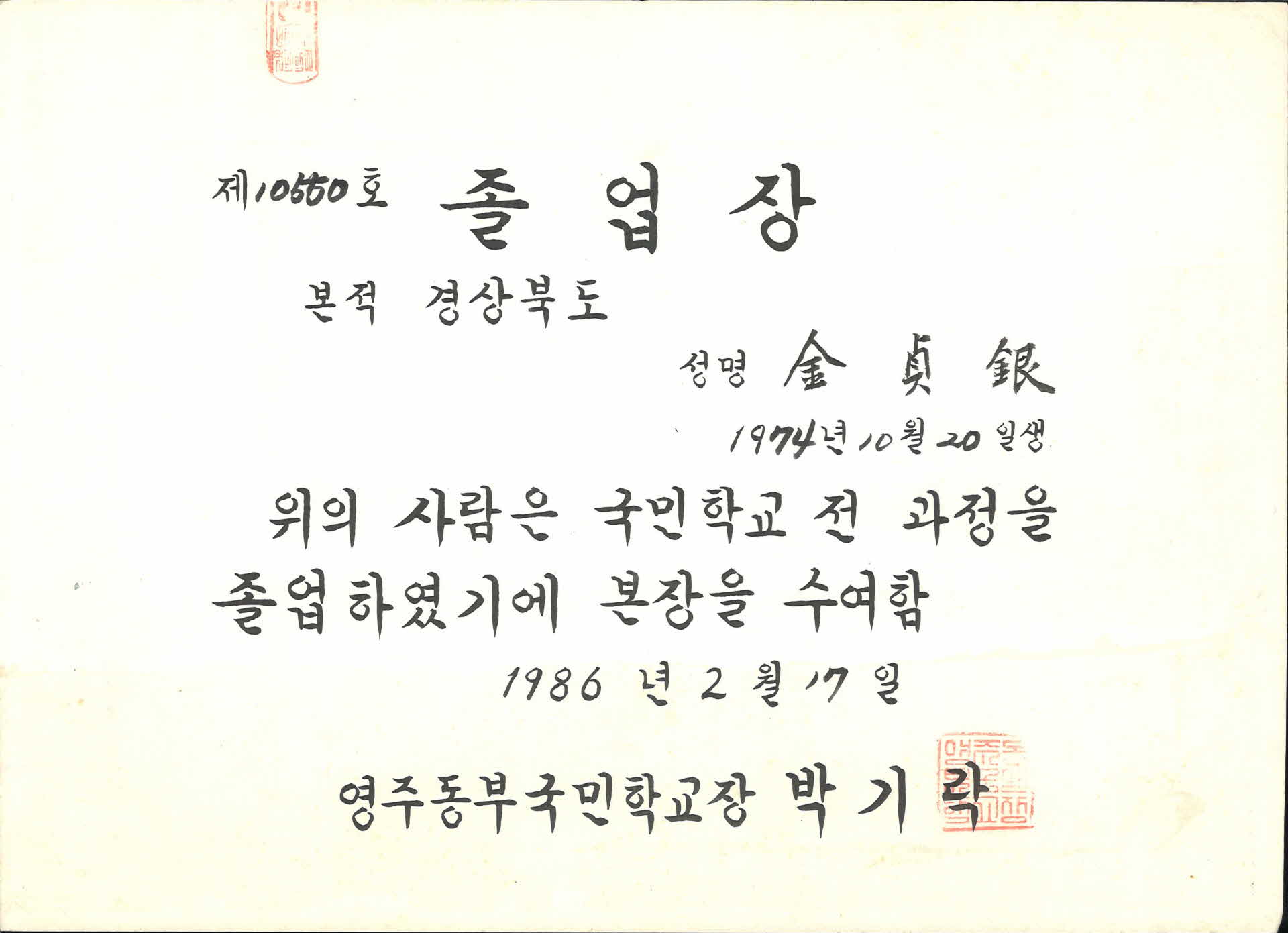 | 기록물명 | 1986년 영주동부국민학교 졸업장 | ||