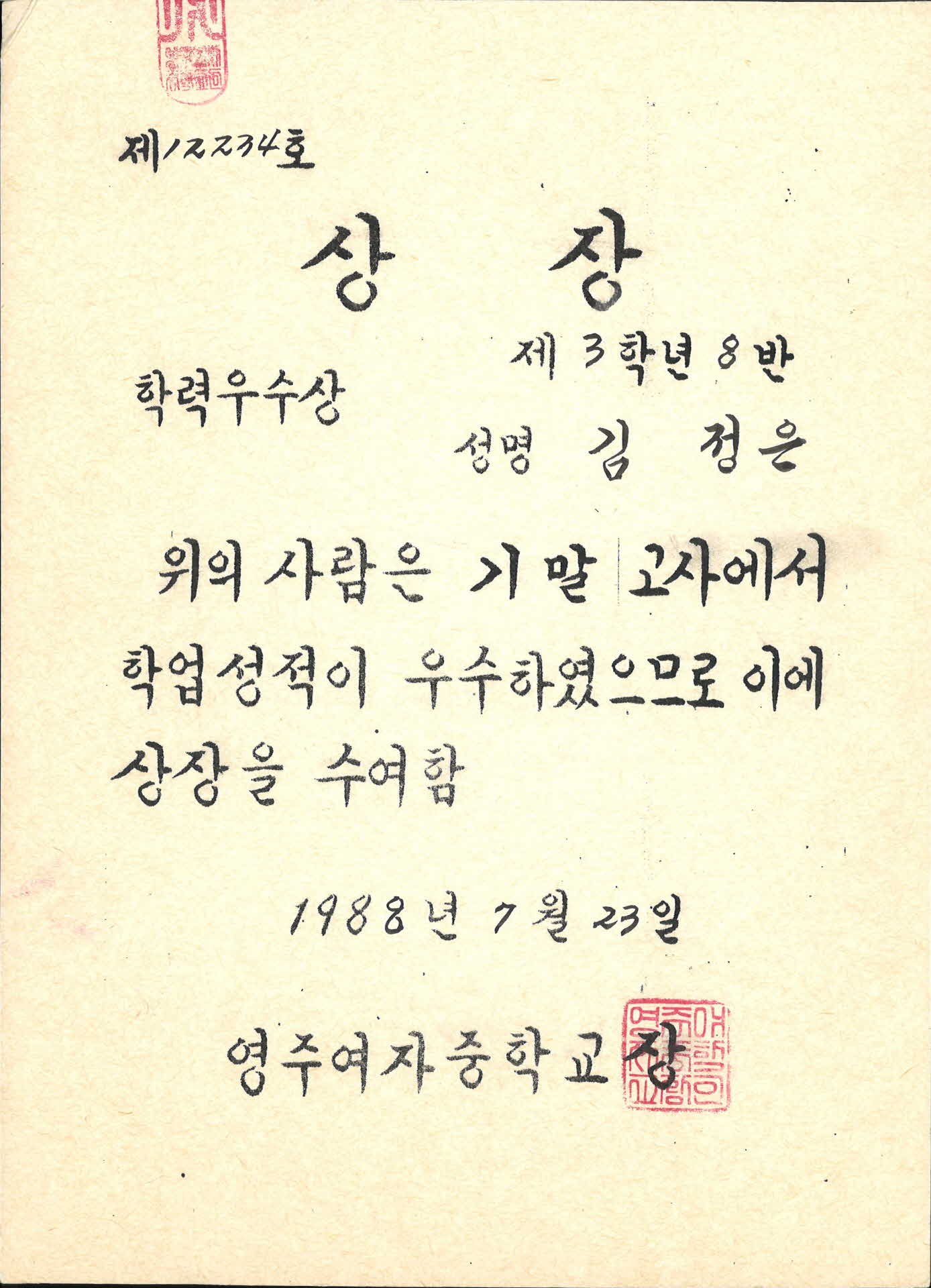 1988년 영주여자중학교 학력우수상 상장