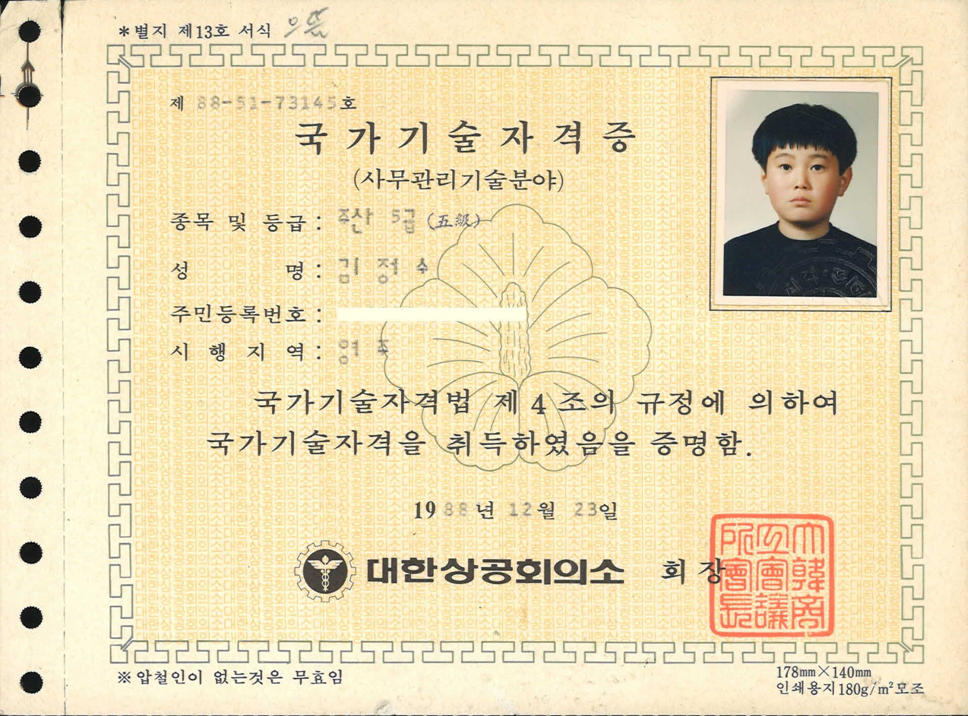 기록물명 주산 5급 자격증