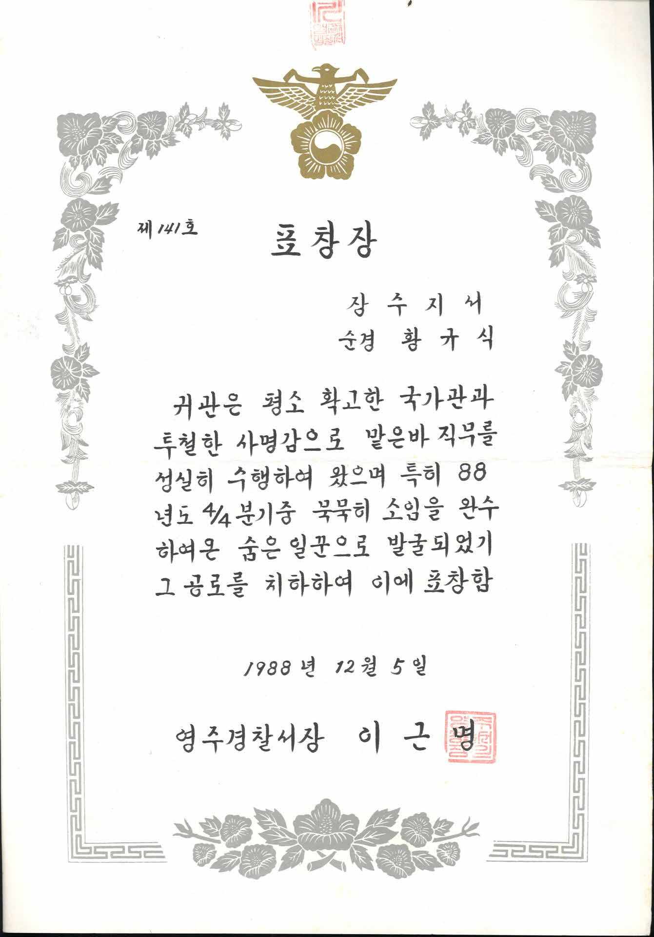 1988년 영주경찰서장 표창장