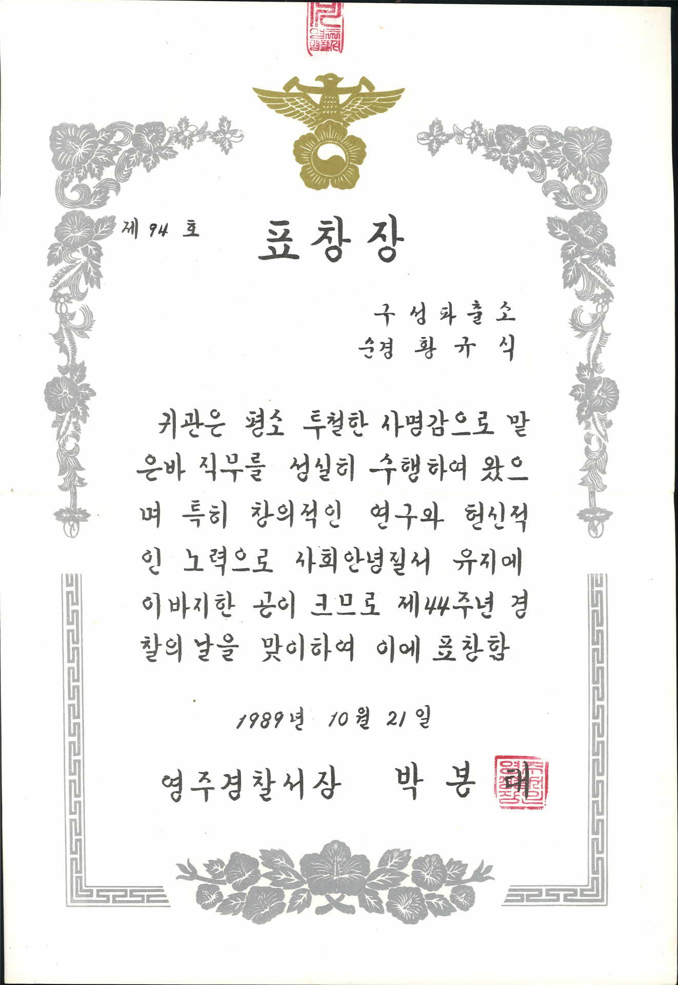 | 기록물명 | 1989년 영주경찰서장 표창장 | ||