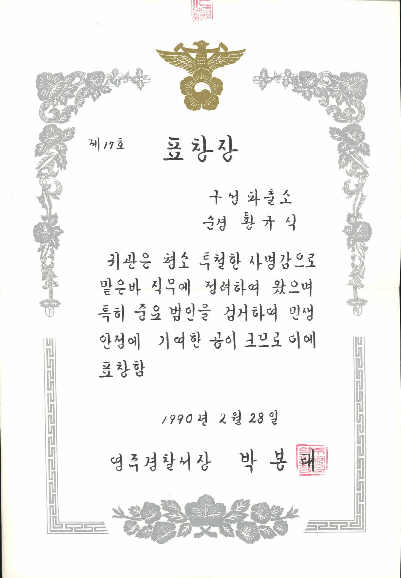 1990년 영주경찰서장 표창장 > 영주, 영주사람