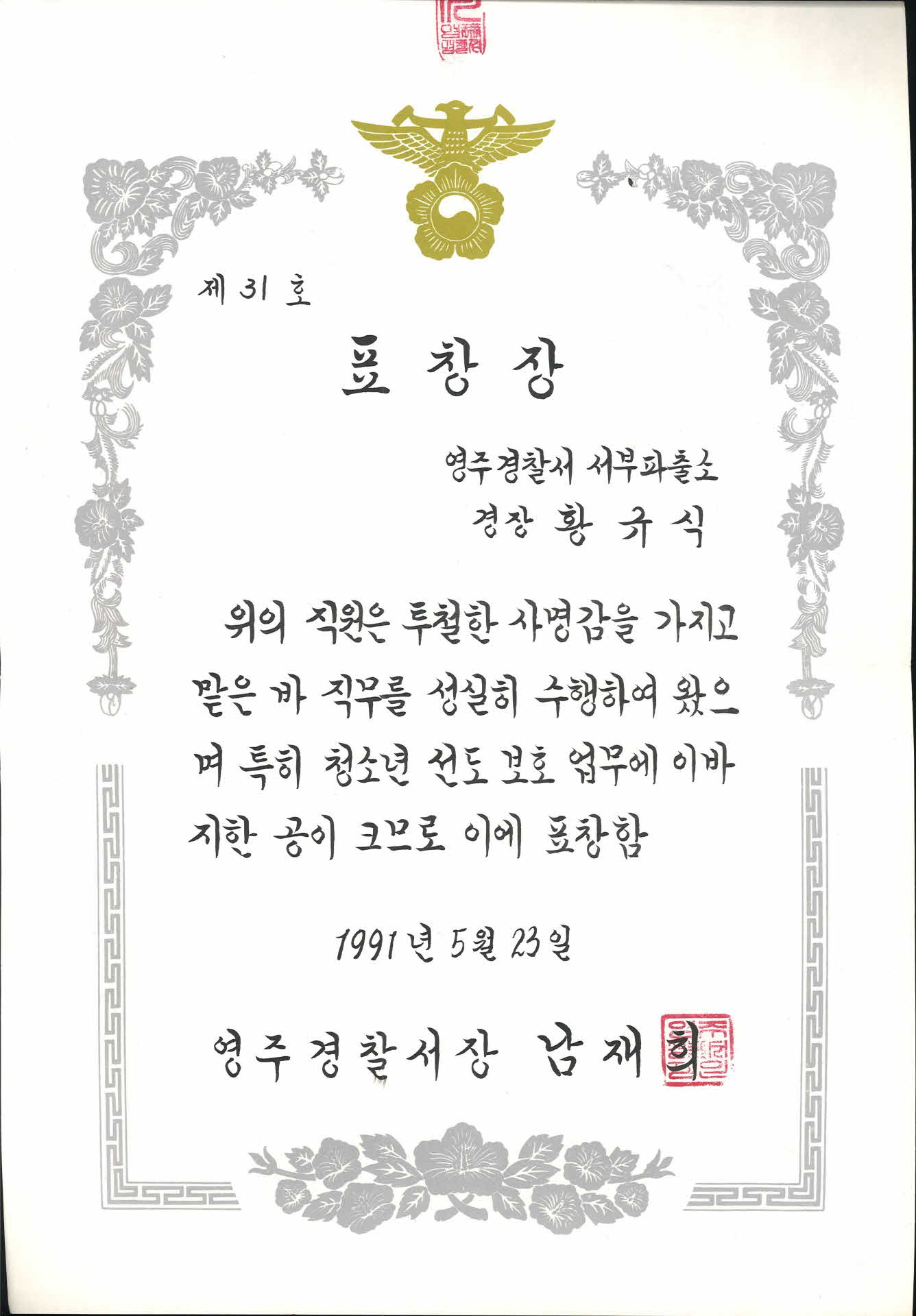 | 기록물명 | 1991년 영주경찰서장 표창장 | ||