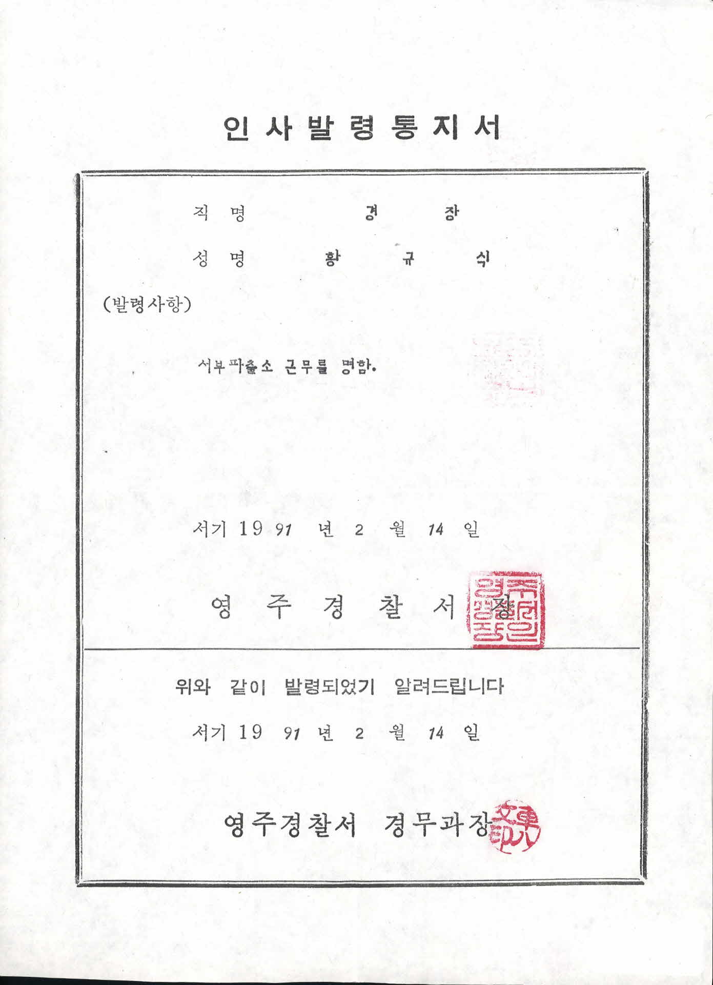 1991년 경찰 인사발령통지서(영주경찰서)