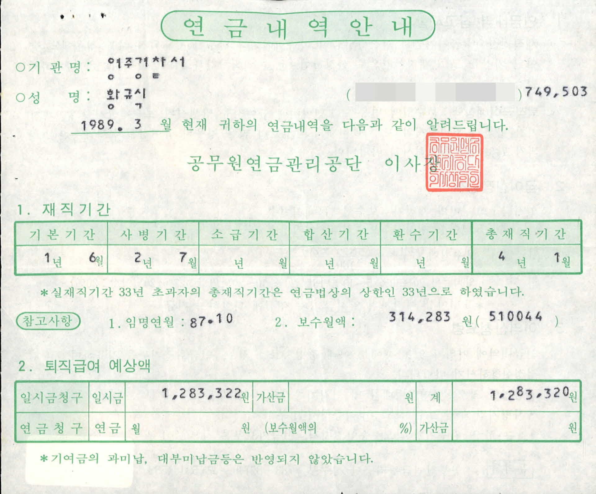 1989년 경찰 연금내역안내